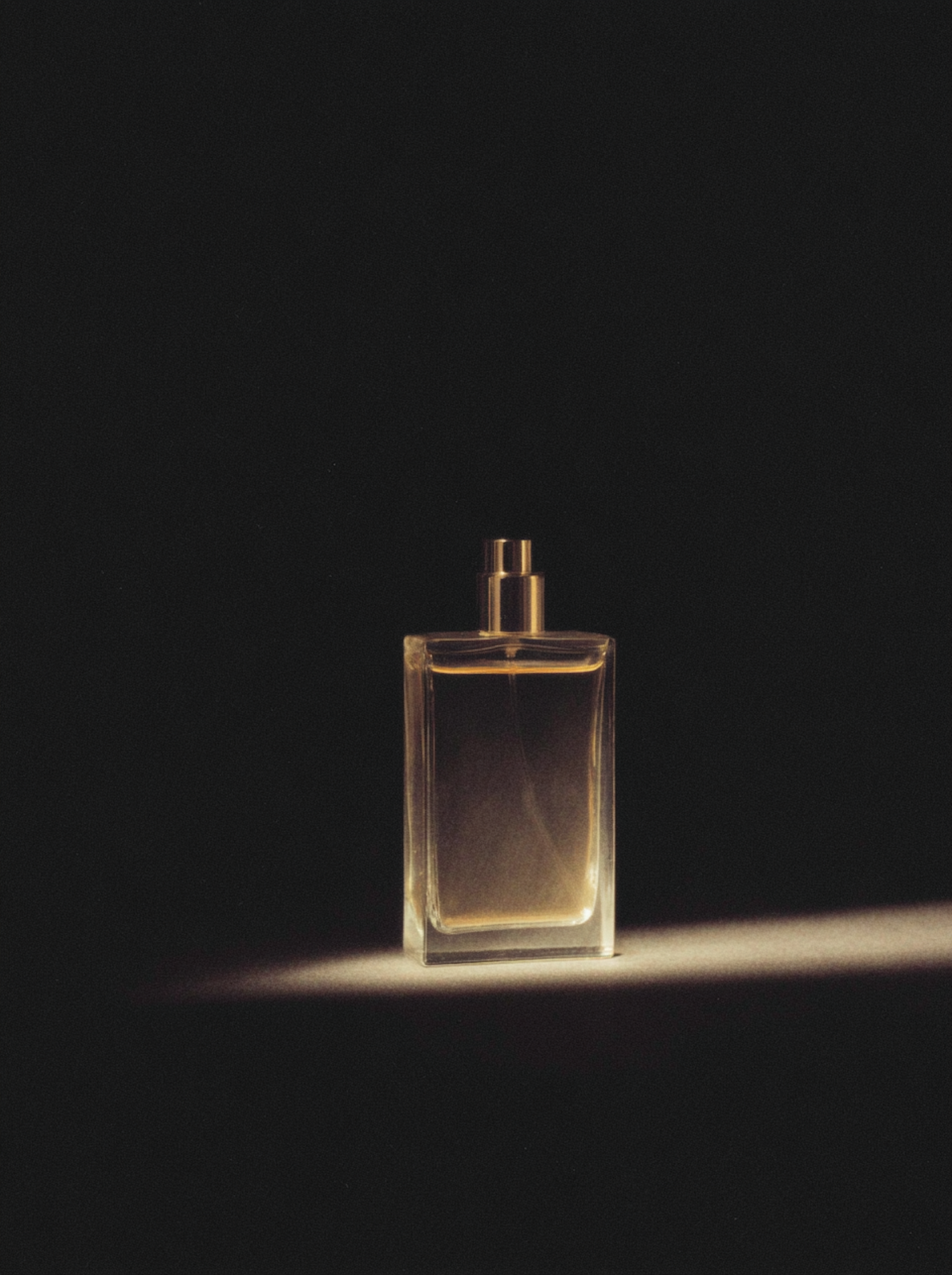 A minimalist photo of a glass perfume bottle with golden liquid, illuminated against a dark background, creating a dramatic and elegant effect.