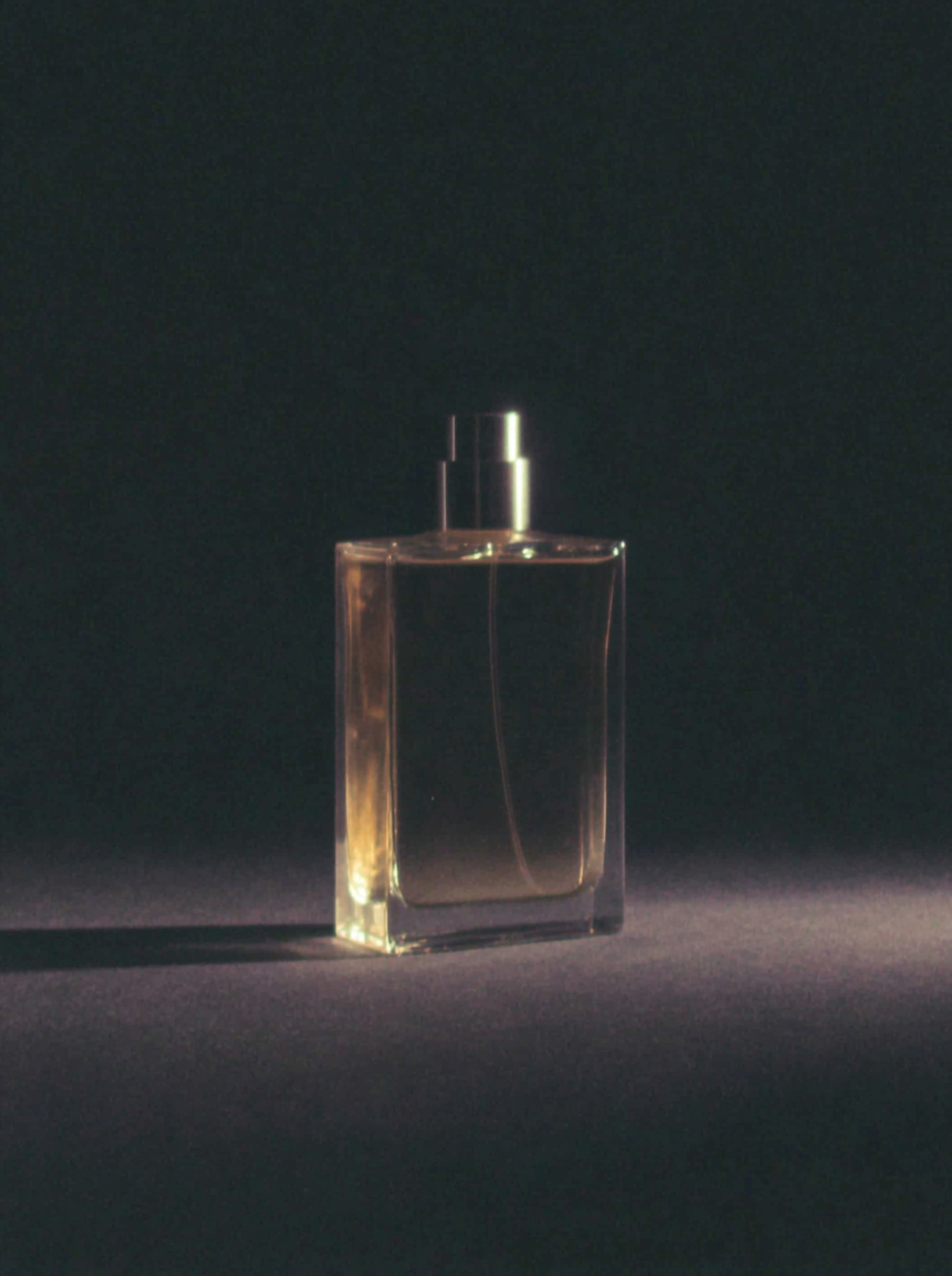 A sleek glass perfume bottle with amber liquid, set against a dark background, showcasing its elegant and minimalistic design.