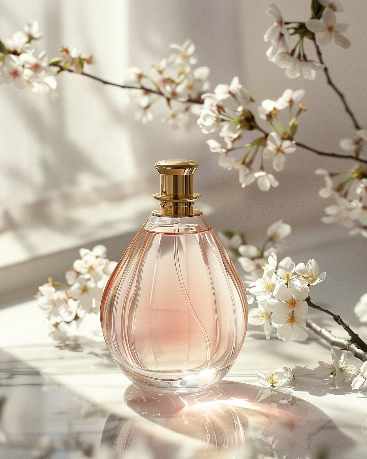Elegant perfume bottle with golden cap surrounded by cherry blossoms, reflecting luxury and freshness in soft natural light.