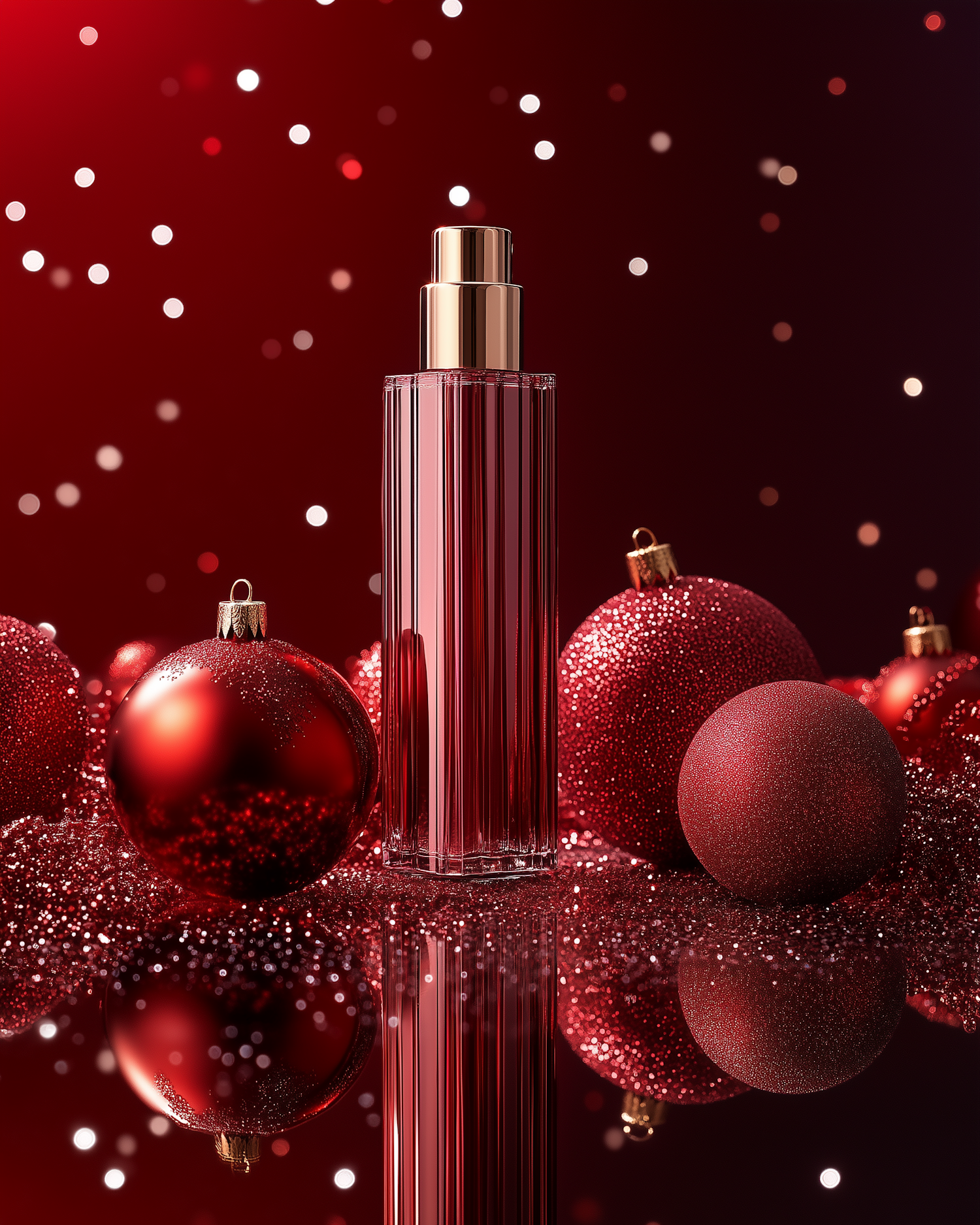 Elegant red perfume bottle with gold cap surrounded by festive red Christmas ornaments on a reflective surface.