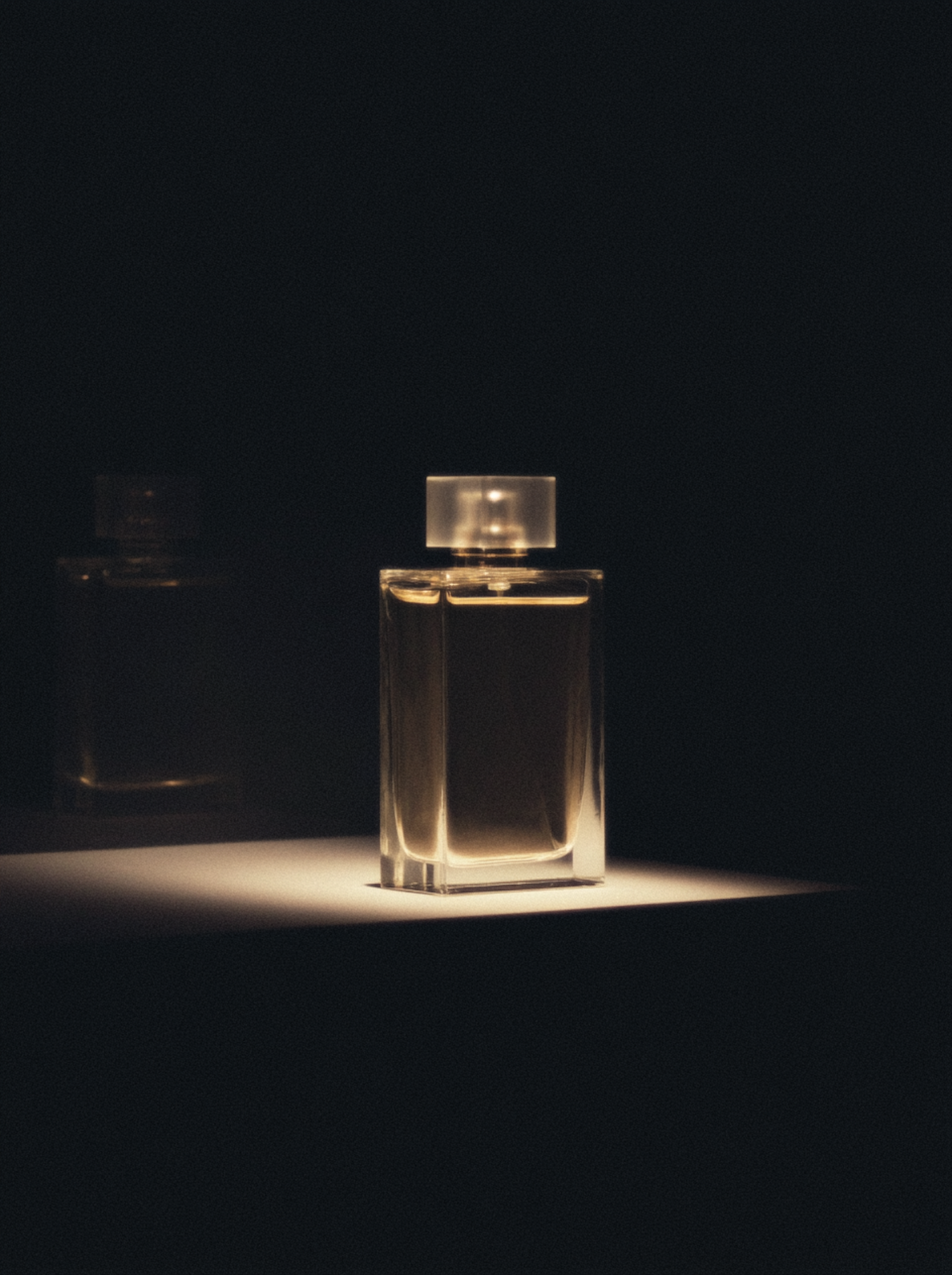 A sleek glass perfume bottle with golden liquid, illuminated dramatically against a dark background, exuding elegance and simplicity.