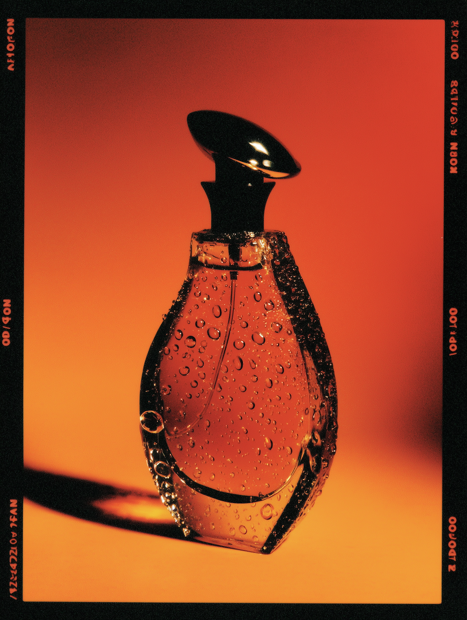 A stylish perfume bottle with water droplets on a vibrant orange background, showcasing its sleek design and luxurious appeal.