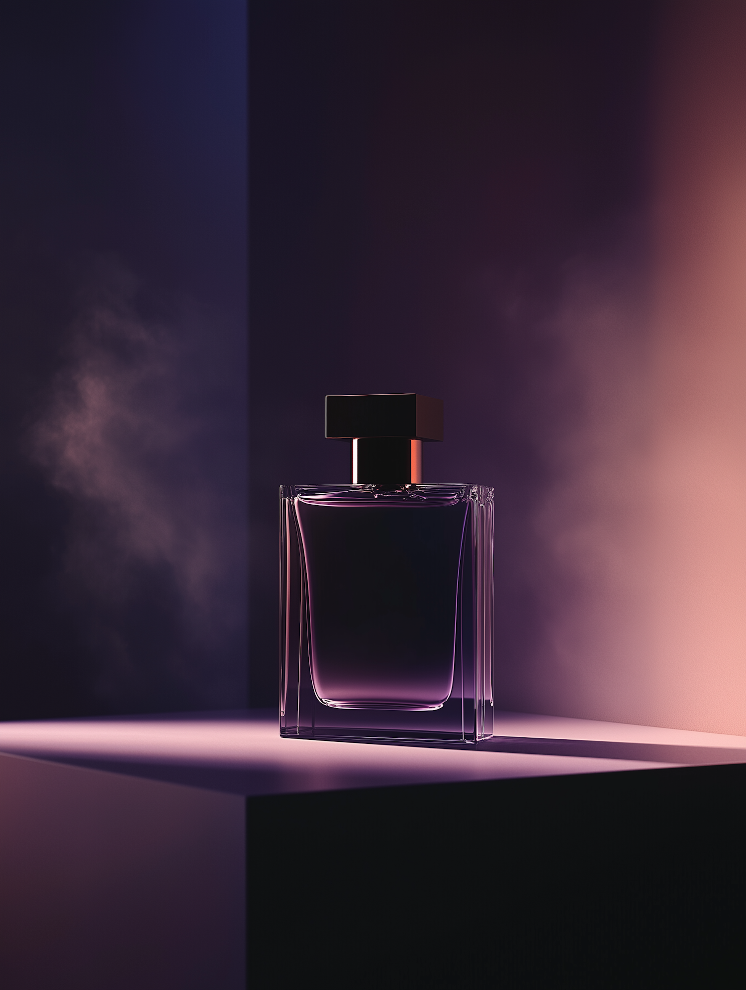 Elegant perfume bottle with a deep purple hue, dramatic lighting, and smoky background, perfect for luxury and sophistication lovers.