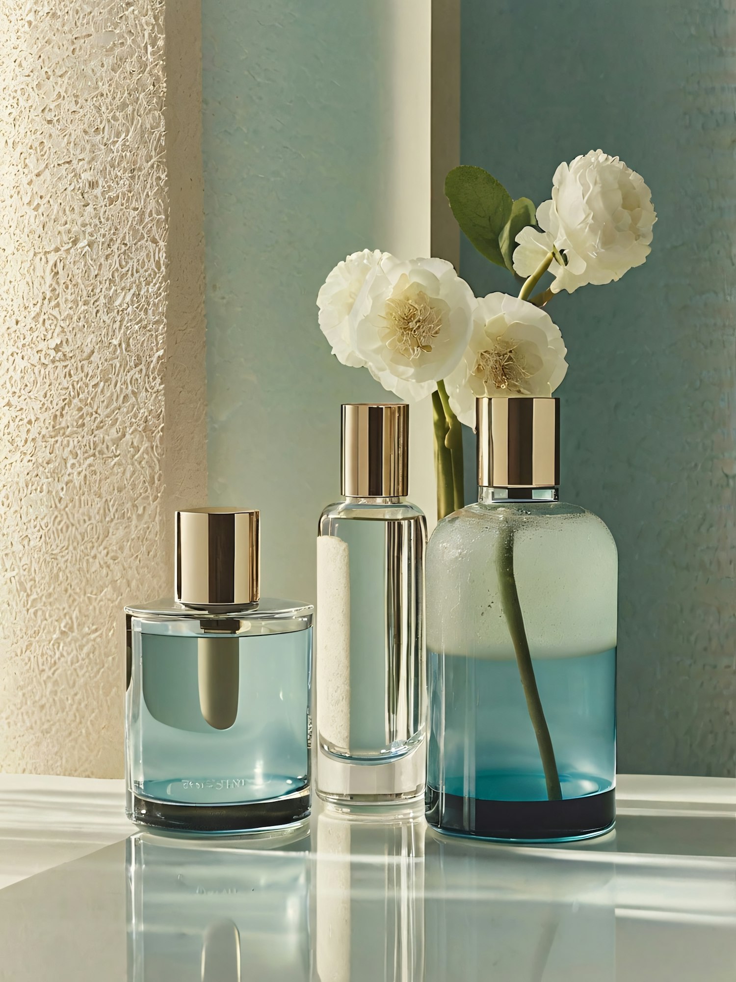 Elegant perfume bottles with blue liquid and metallic caps, set against a textured wall with white flowers. Luxurious and serene ambiance.