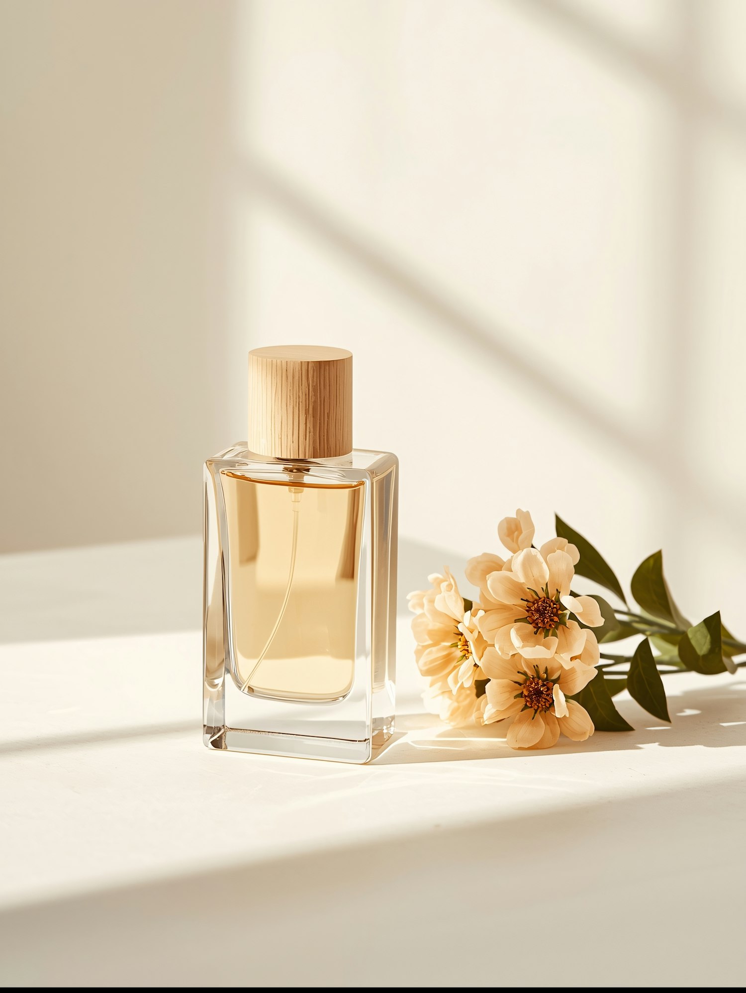 Elegant glass perfume bottle with wooden cap and golden liquid, paired with peach flowers on a sunlit white surface.
