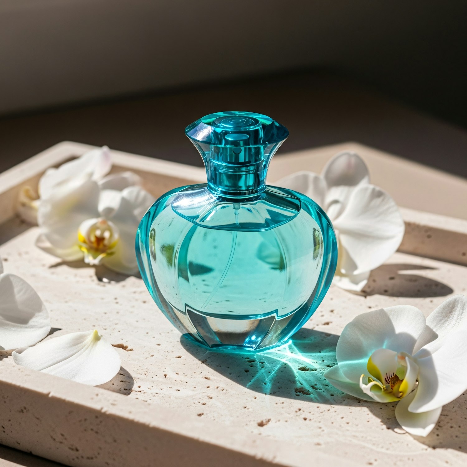 Elegant blue perfume bottle on a beige tray with white orchids, bathed in soft natural light for a serene and luxurious vibe.