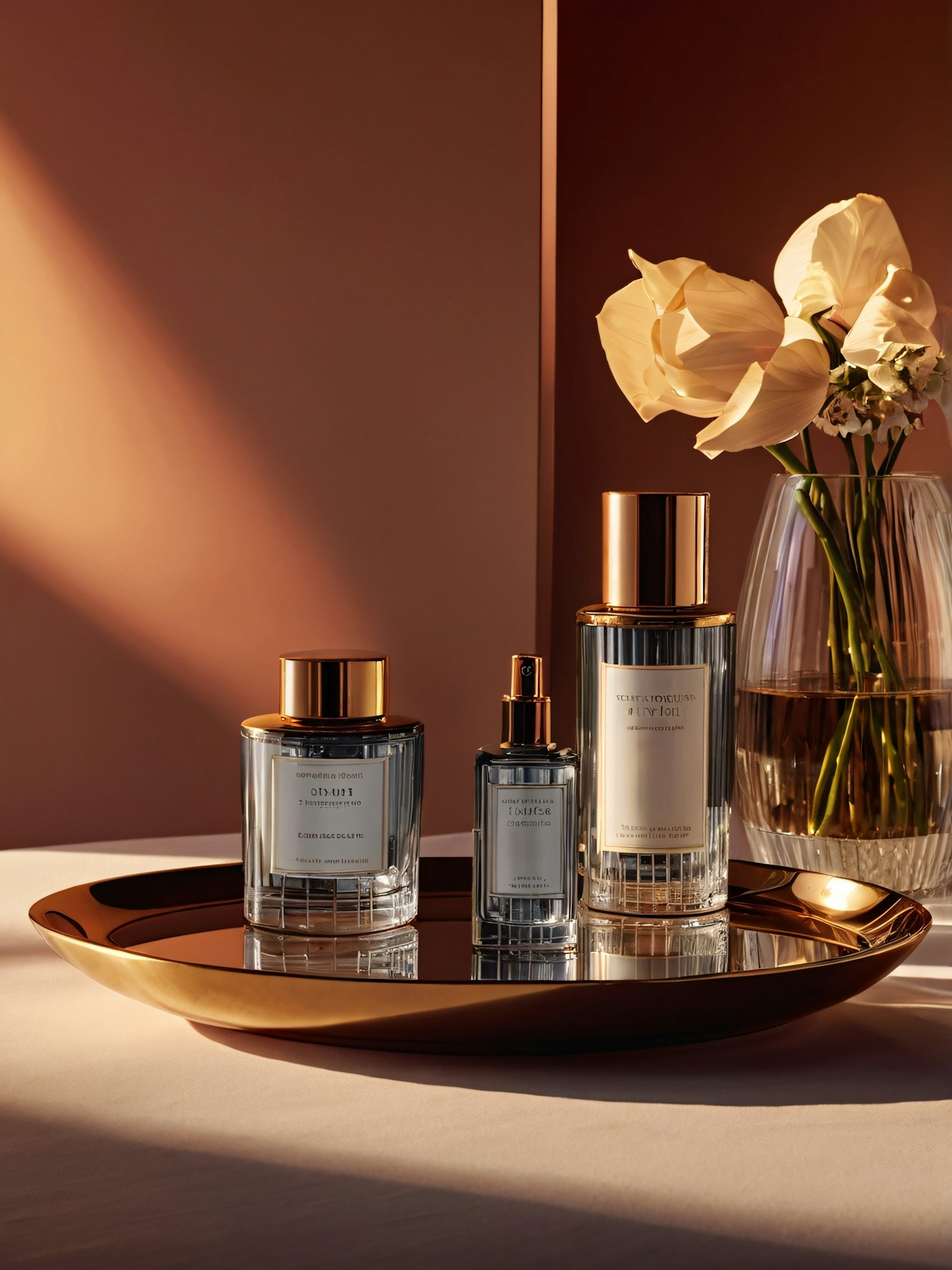 Elegant perfume bottles on a golden tray with white flowers in a vase, set against a warm brown background with soft lighting.