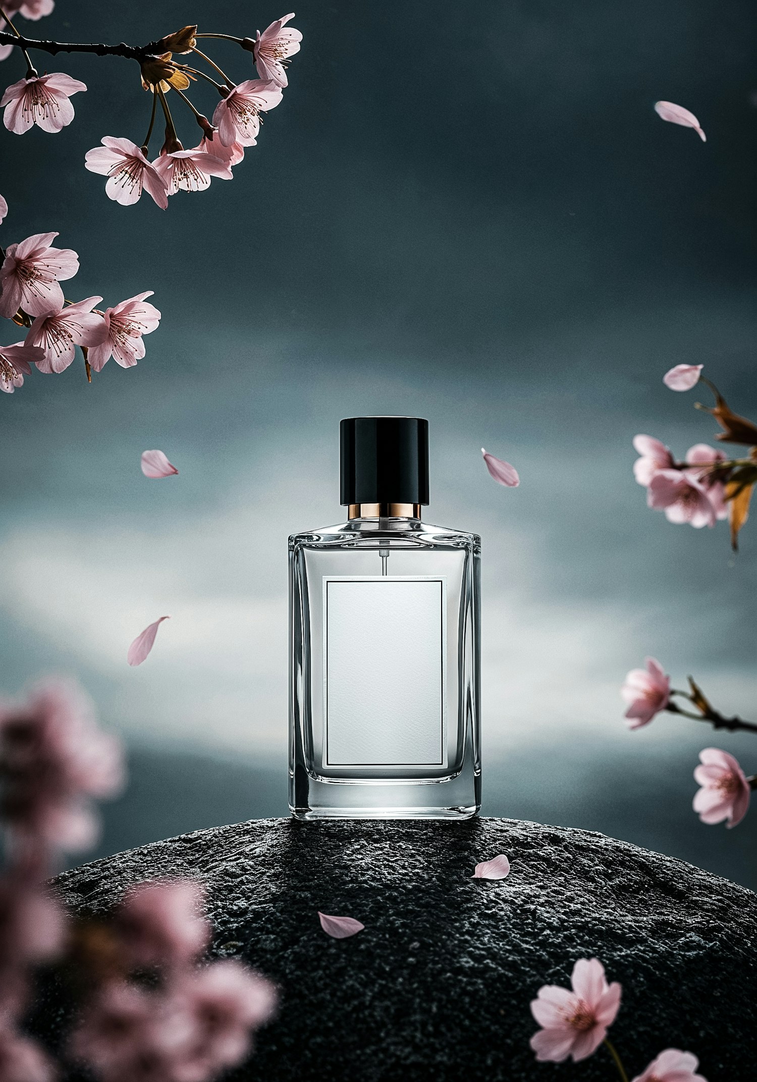 Minimalist perfume bottle on a stone, surrounded by cherry blossoms and falling petals, set against a moody teal-gray background.