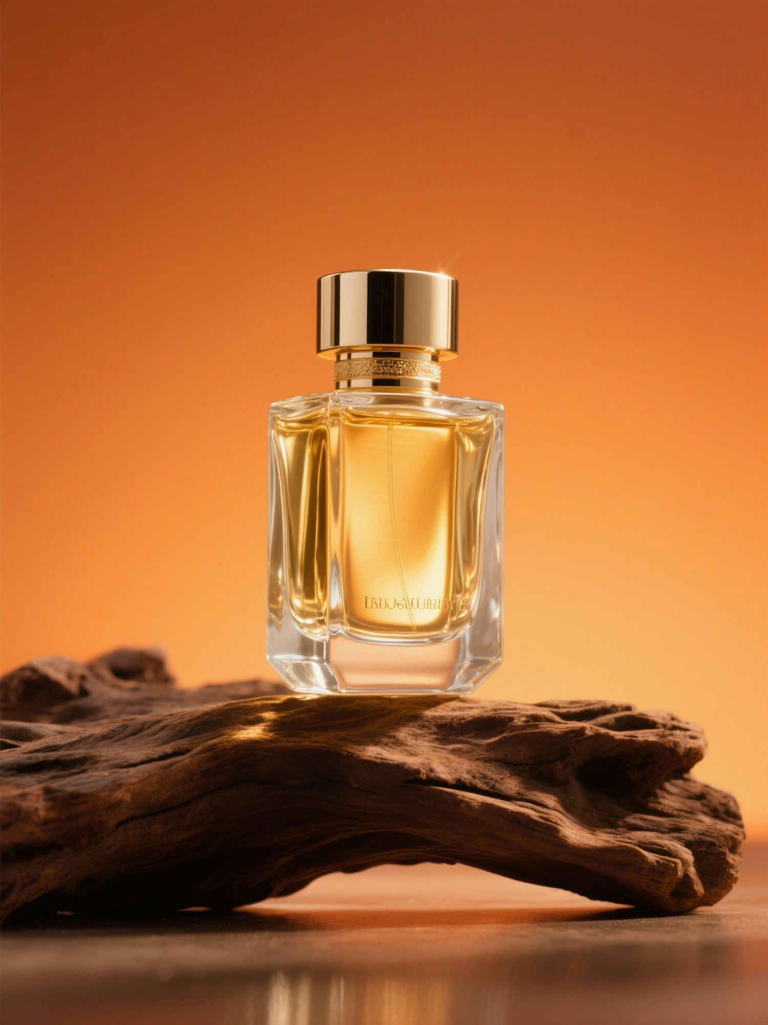 Elegant perfume bottle with golden accents on driftwood, set against a warm orange gradient background, exuding luxury and sophistication.