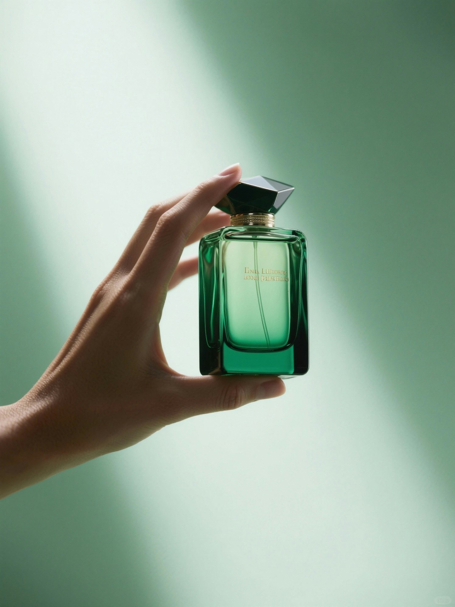 A minimalist, high-end product shot: a hand gracefully holding a sleek, rectangular luxury perfume bottle. Soft, diffused emerald-green lighting enhances the sharp edges and smooth glass surface, casting elegant shadows. Set against a softly lit green background, the clean composition evokes sophistication and a luxury editorial aesthetic.