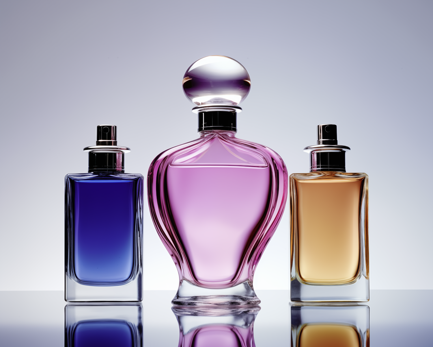 Three stylish perfume bottles in pink, blue, and amber hues, elegantly arranged with a sleek, reflective background.