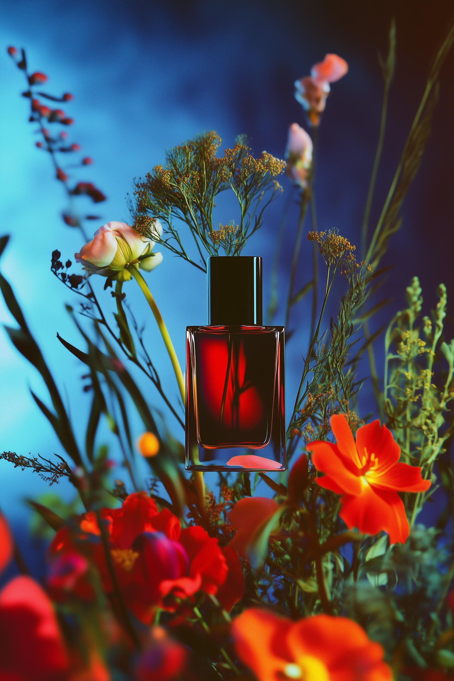 A luxurious red perfume bottle surrounded by vibrant orange and pink flowers, set against a dreamy blue background.