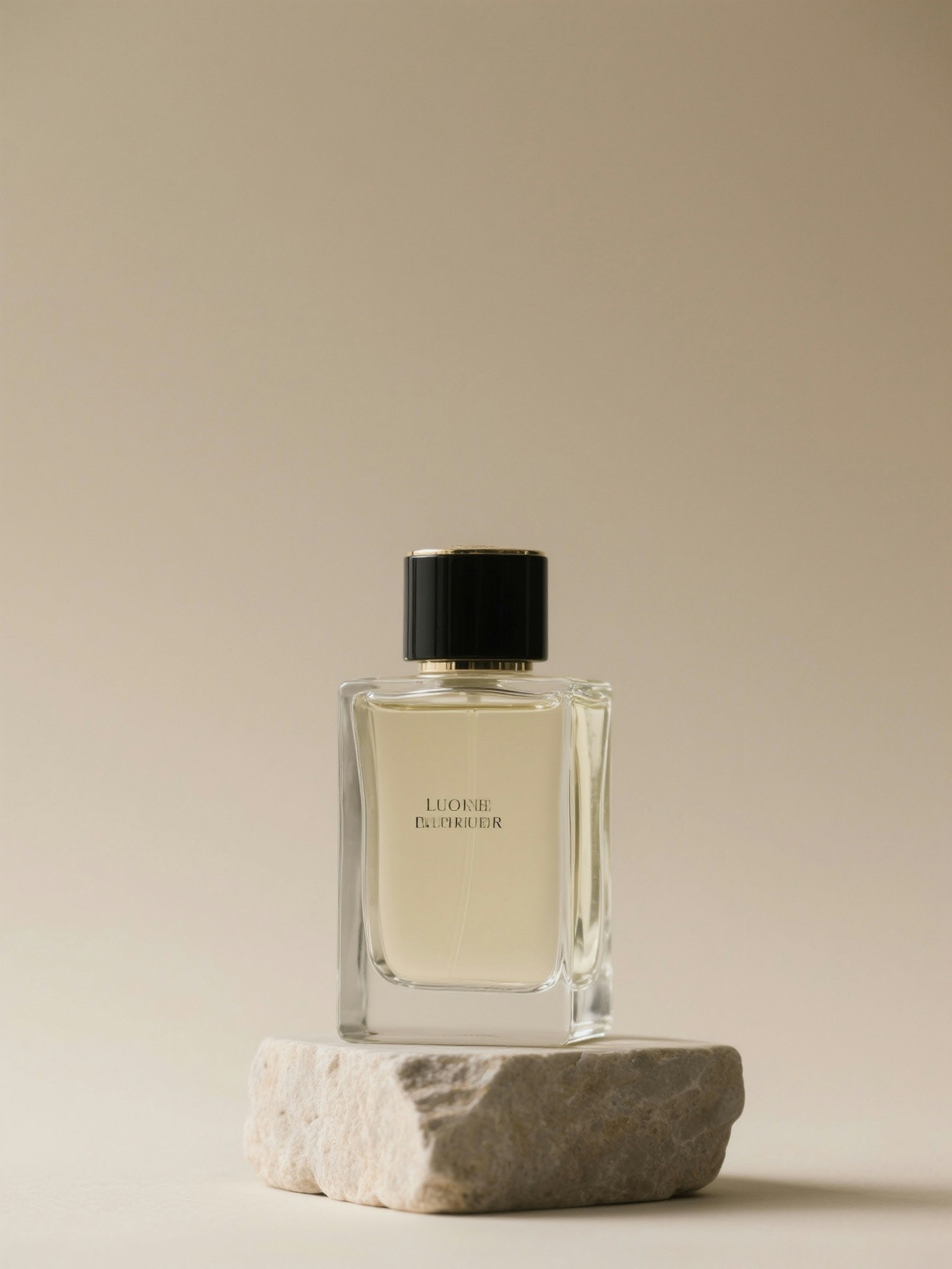 Elegant perfume bottle with a black cap on a stone slab, set against a neutral beige background, showcasing minimalist design.