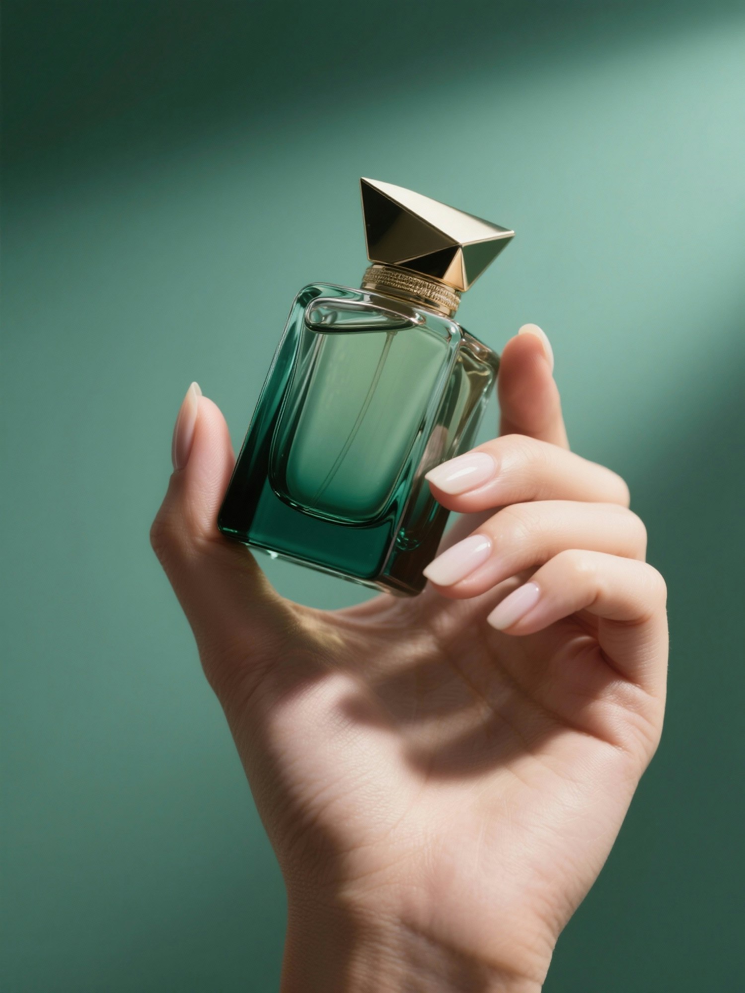 A minimalist, high-end product shot: a hand gracefully holding a sleek, rectangular luxury perfume bottle. Soft, diffused emerald-green lighting enhances the sharp edges and smooth glass surface, casting elegant shadows. Set against a softly lit green background, the clean composition evokes sophistication and a luxury editorial aesthetic.