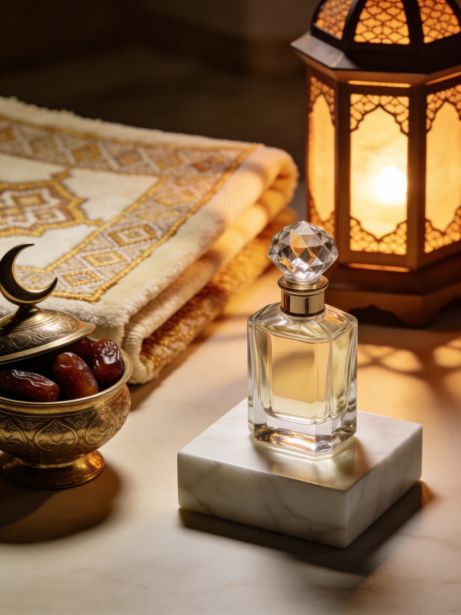 A high‑definition luxury editorial still life. A perfume bottle displayed on a white‑marble stand sits beside a folded rug with subtle geometric embroidery. A decorative container with a crescent‑moon lid holds dates. Warm lantern light creates a serene, high‑end Ramadan atmosphere. No text, no logos.