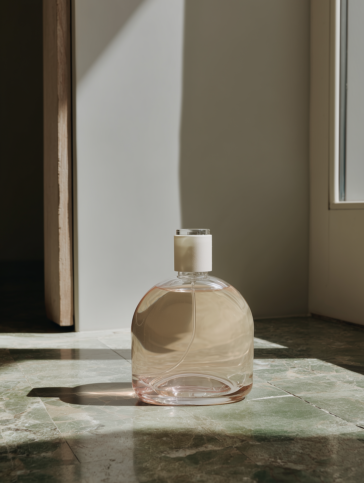 A minimalist glass perfume bottle with pink liquid on a green marble surface, illuminated by soft sunlight through a window.