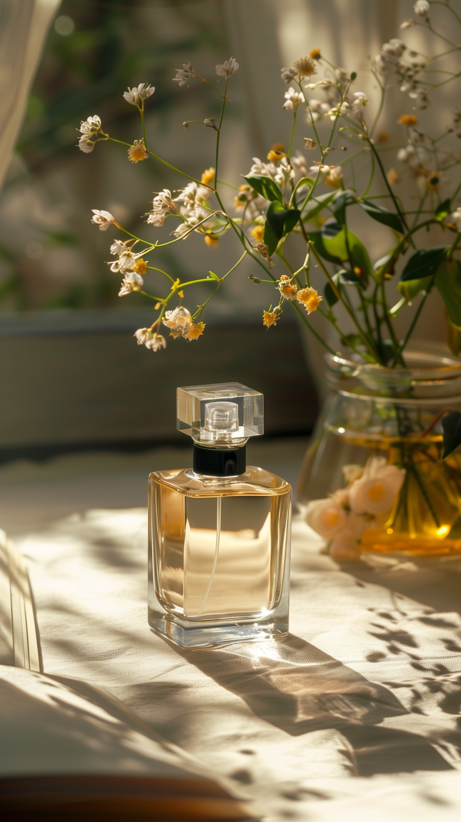 Elegant glass perfume bottle with golden liquid, surrounded by delicate flowers on a sunlit table, creating a serene and fresh vibe.