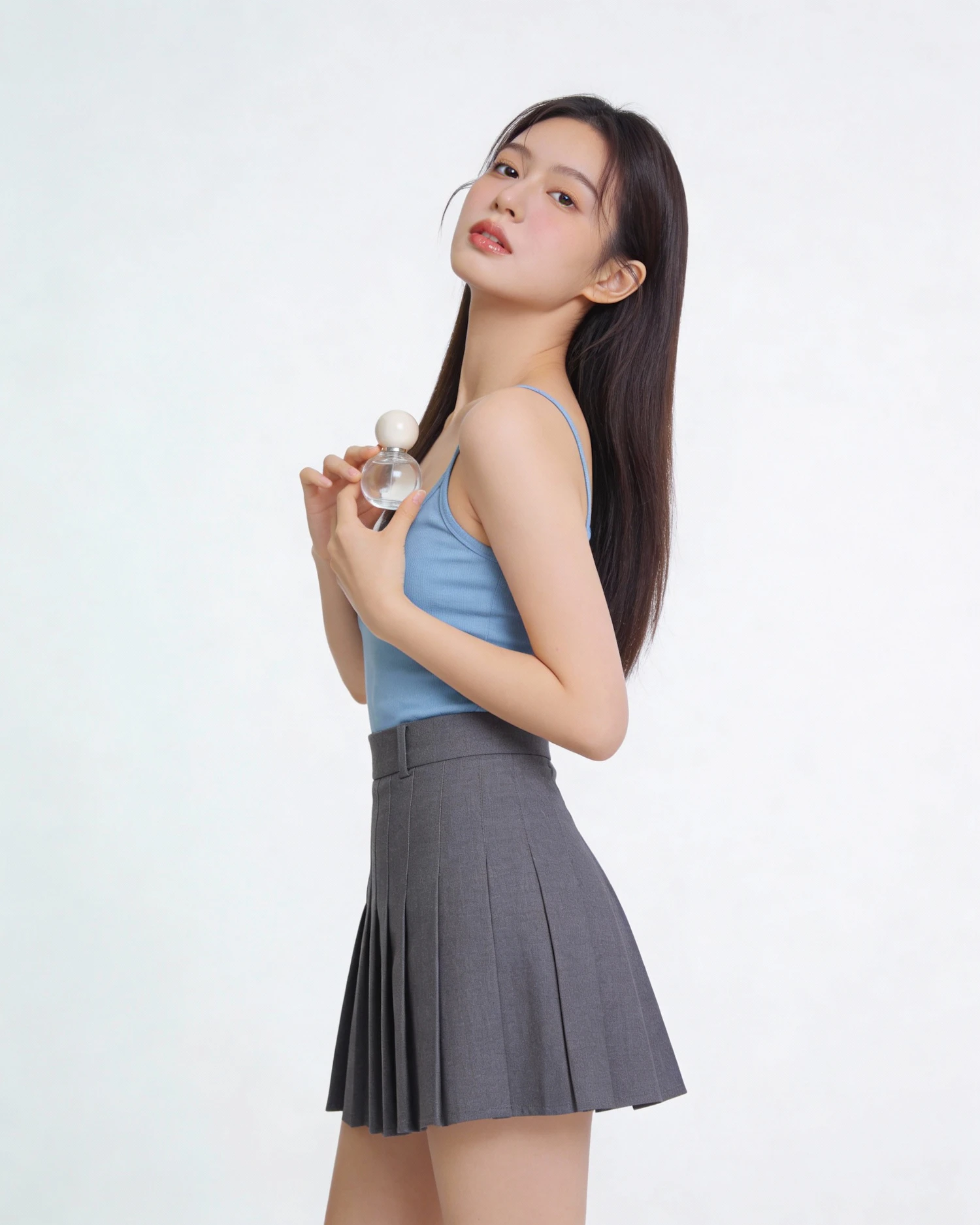 A young woman in a blue top and gray skirt holds a perfume bottle, posing gracefully against a white background.