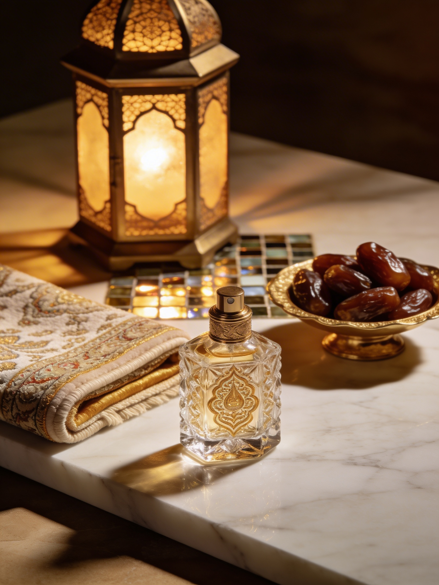 Elegant arrangement with a golden lantern, ornate perfume bottle, embroidered fabric, and dates on a marble surface.