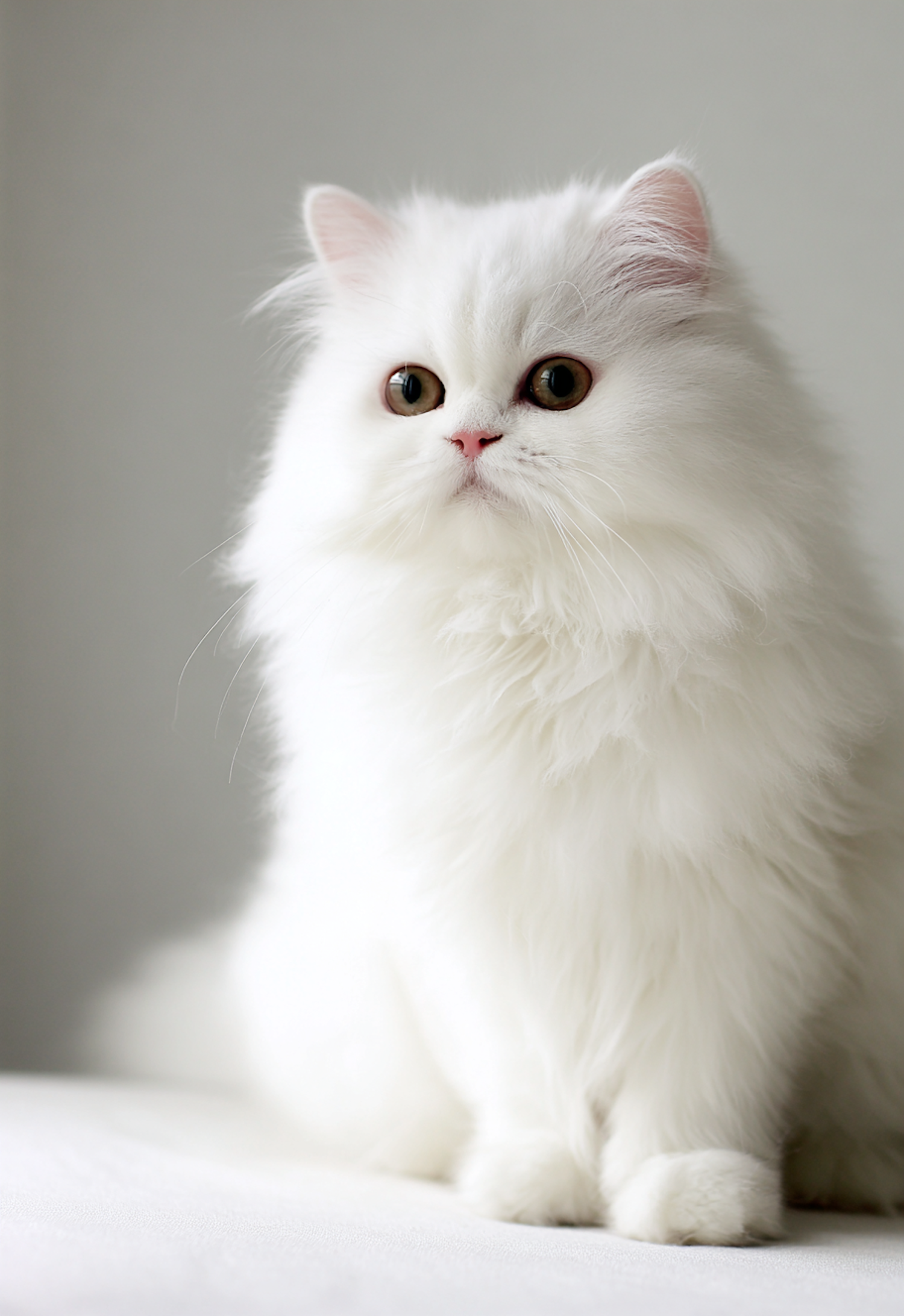 A fluffy white Persian cat with long hair and amber eyes sits on a white surface, exuding grace and charm.