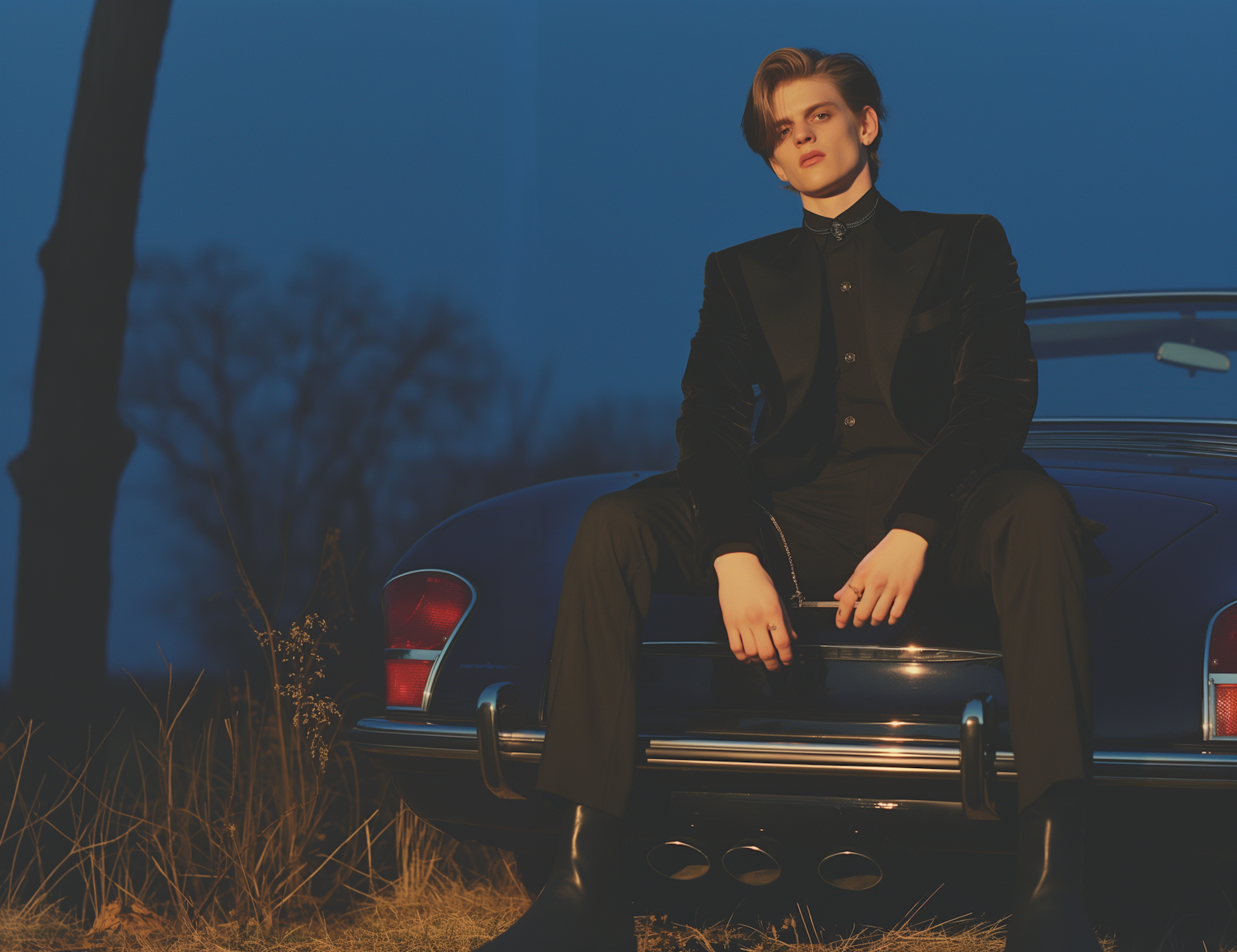 Young man in a black suit sitting on a classic car at twilight, exuding elegance and confidence in a moody outdoor setting.