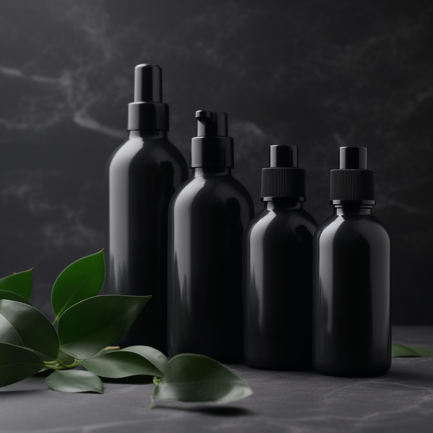 Elegant black bottles with various dispensers on a dark surface, accented by green leaves for a modern, minimalist look.