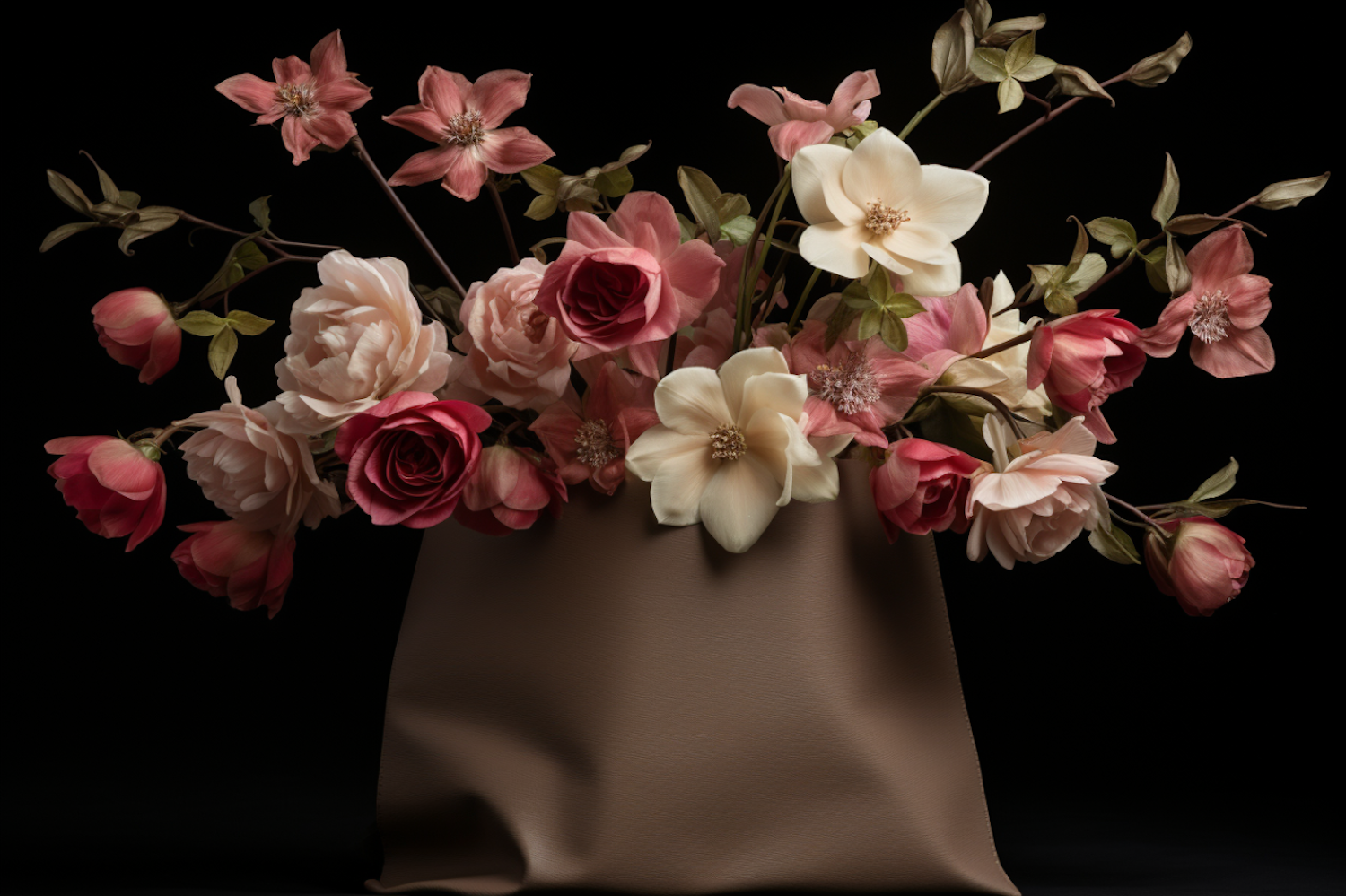 Elegant floral arrangement in a brown bag with pink, cream, and red flowers against a dark background.