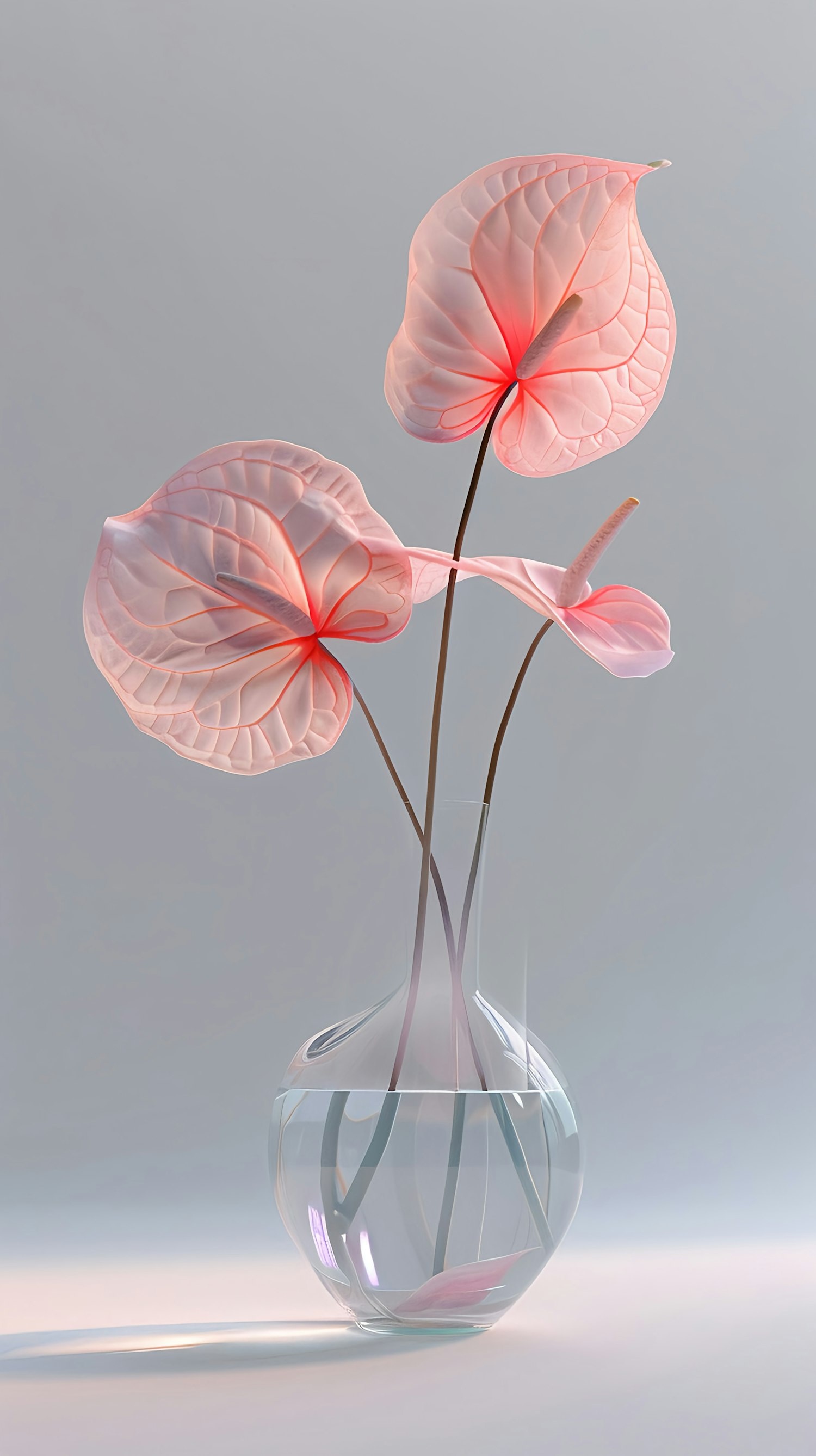 Elegant anthurium flowers with translucent pink petals in a clear glass vase, set against a soft gray background.
