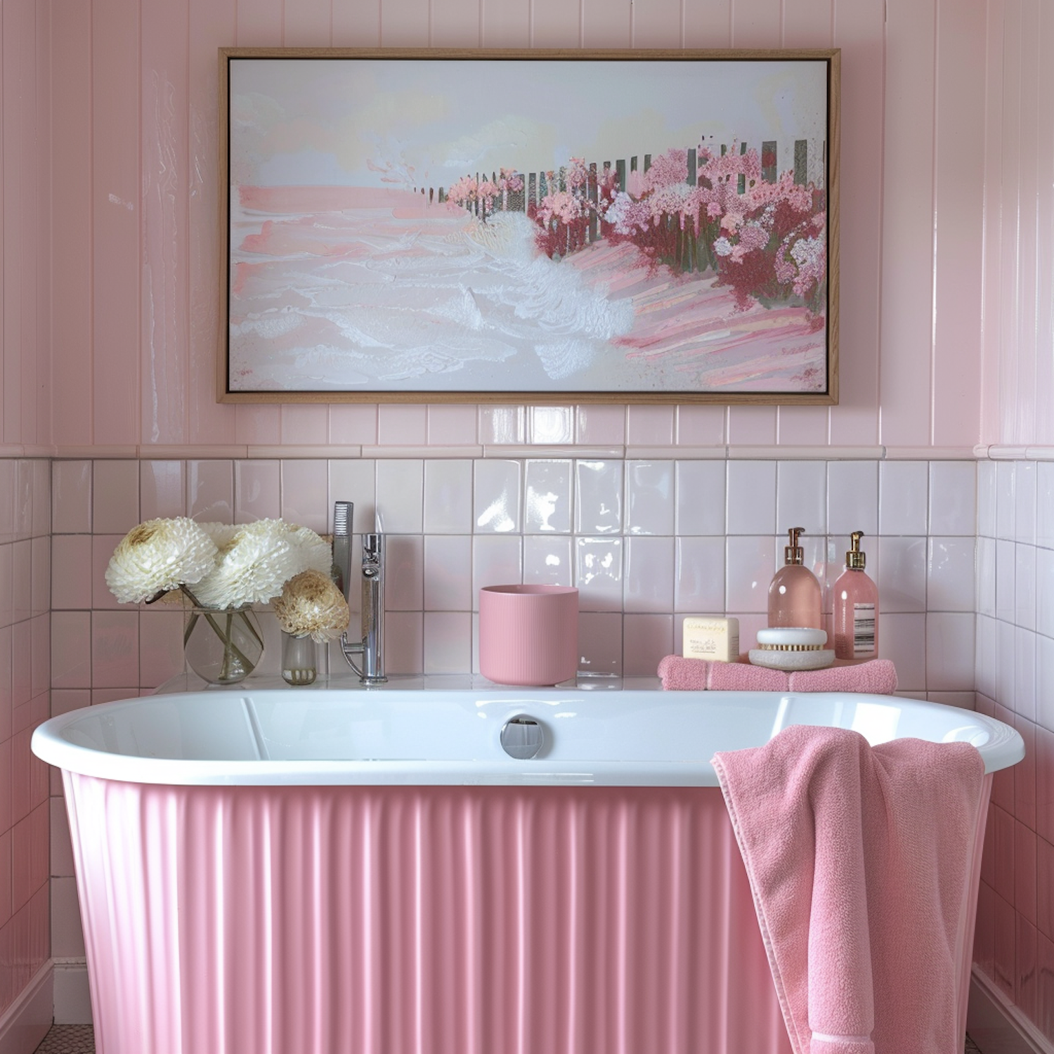 Charming pink-themed bathroom with a ribbed bathtub, pastel artwork, and elegant decor. Perfect for a soothing, stylish retreat.