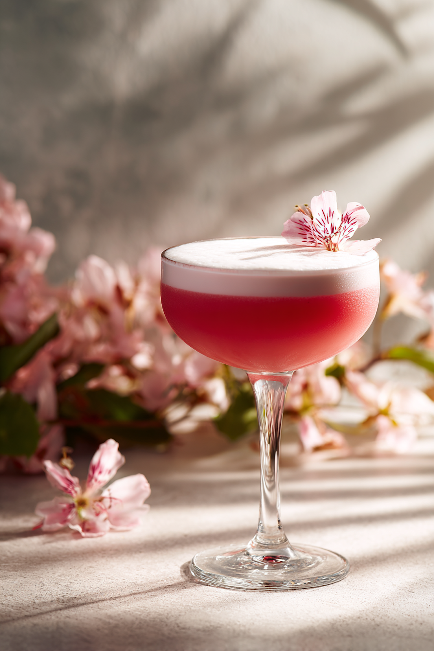A pink cocktail in a coupe glass with frothy foam and a flower garnish, surrounded by soft pink blossoms in natural light.