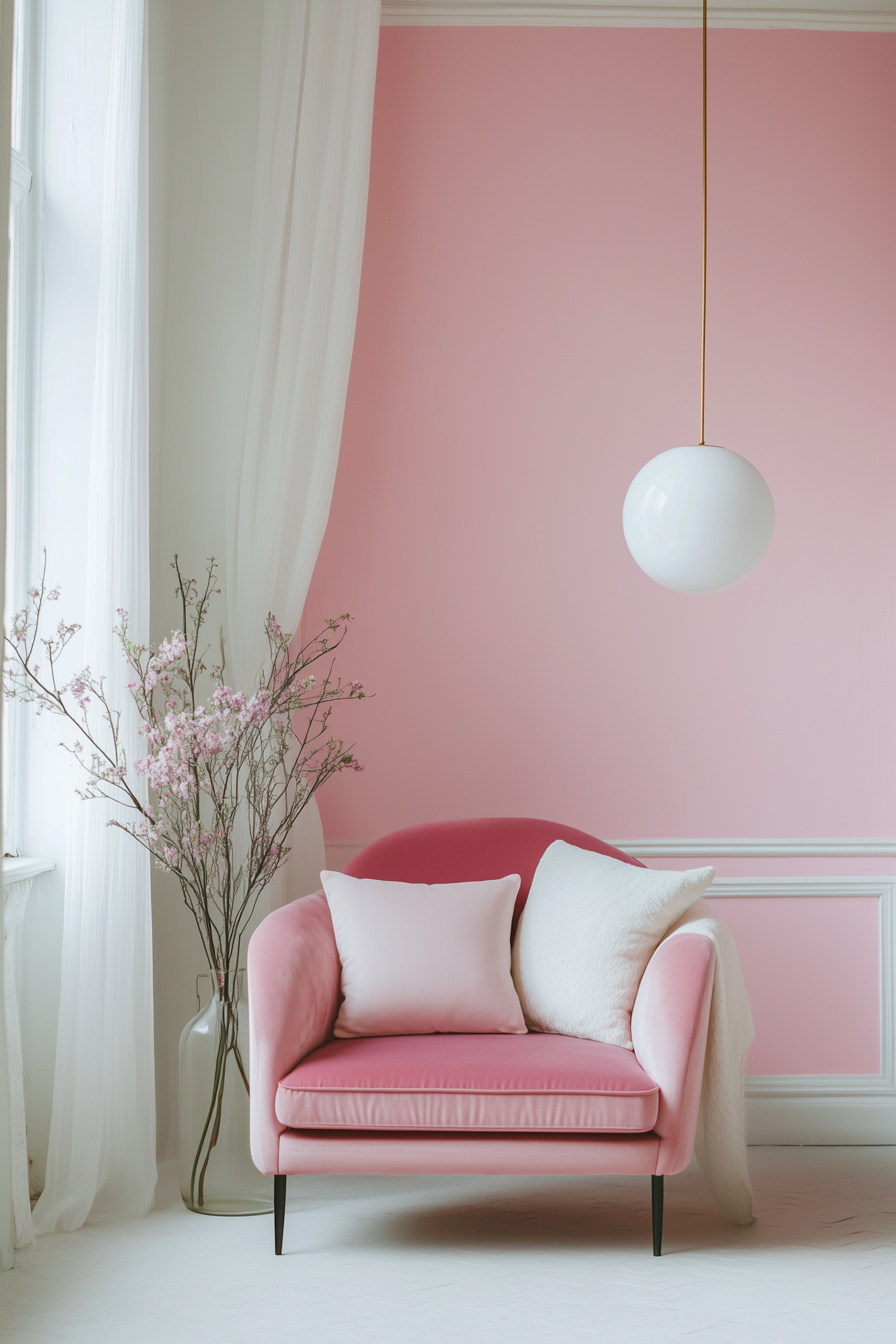 Elegant pink armchair with pillows, pastel pink wall, white globe pendant light, and delicate blossoms in a serene interior.