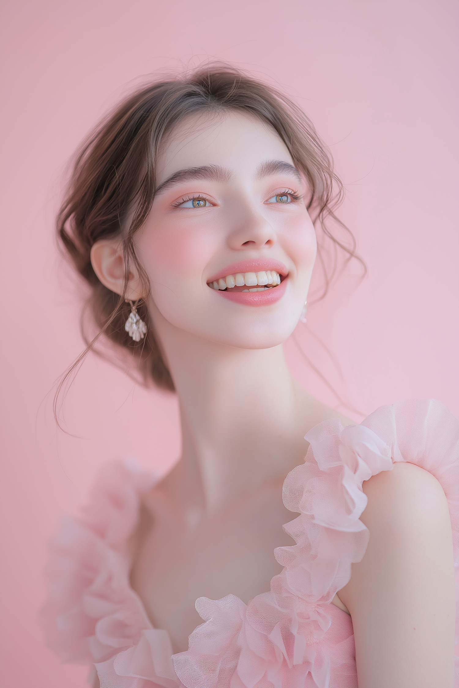 A smiling woman in a pink ruffled dress with crystal earrings, set against a soft pink background. Bright and cheerful vibes.