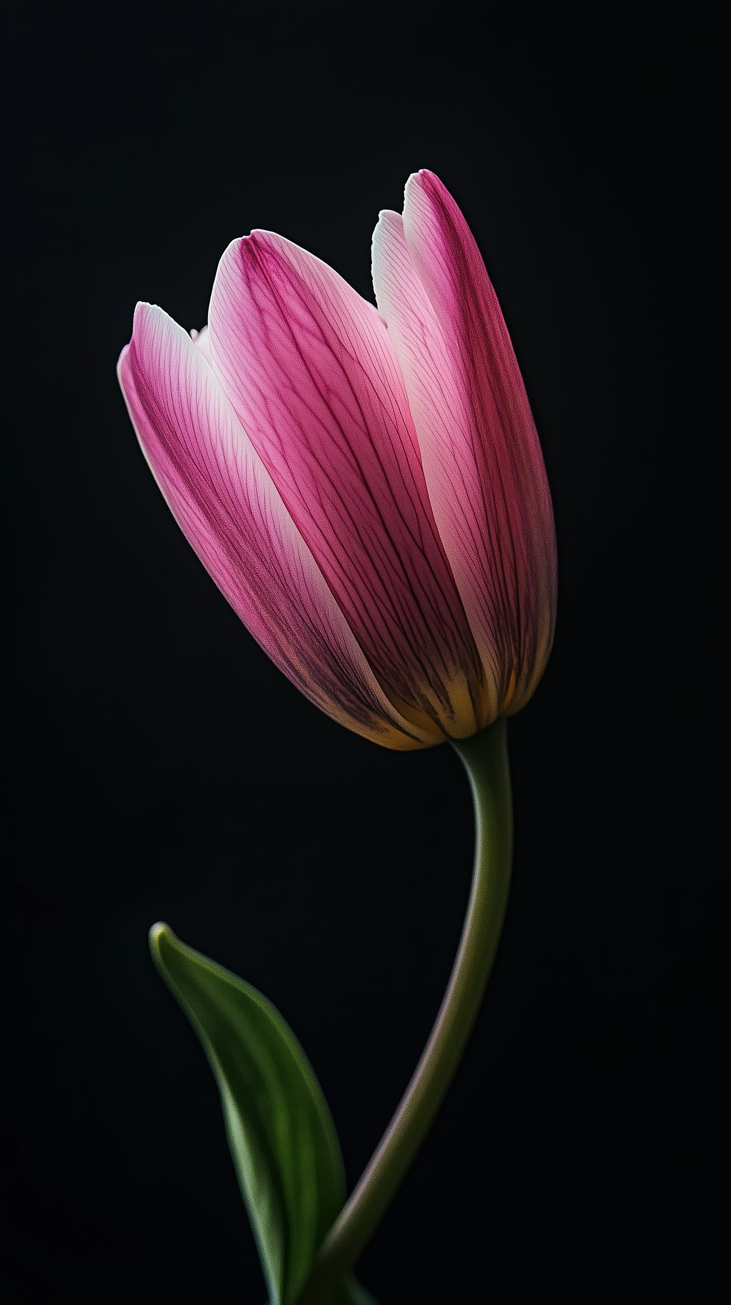 Elegant pink tulip with delicate veins against a dark background, highlighting its vibrant colors and graceful form.
