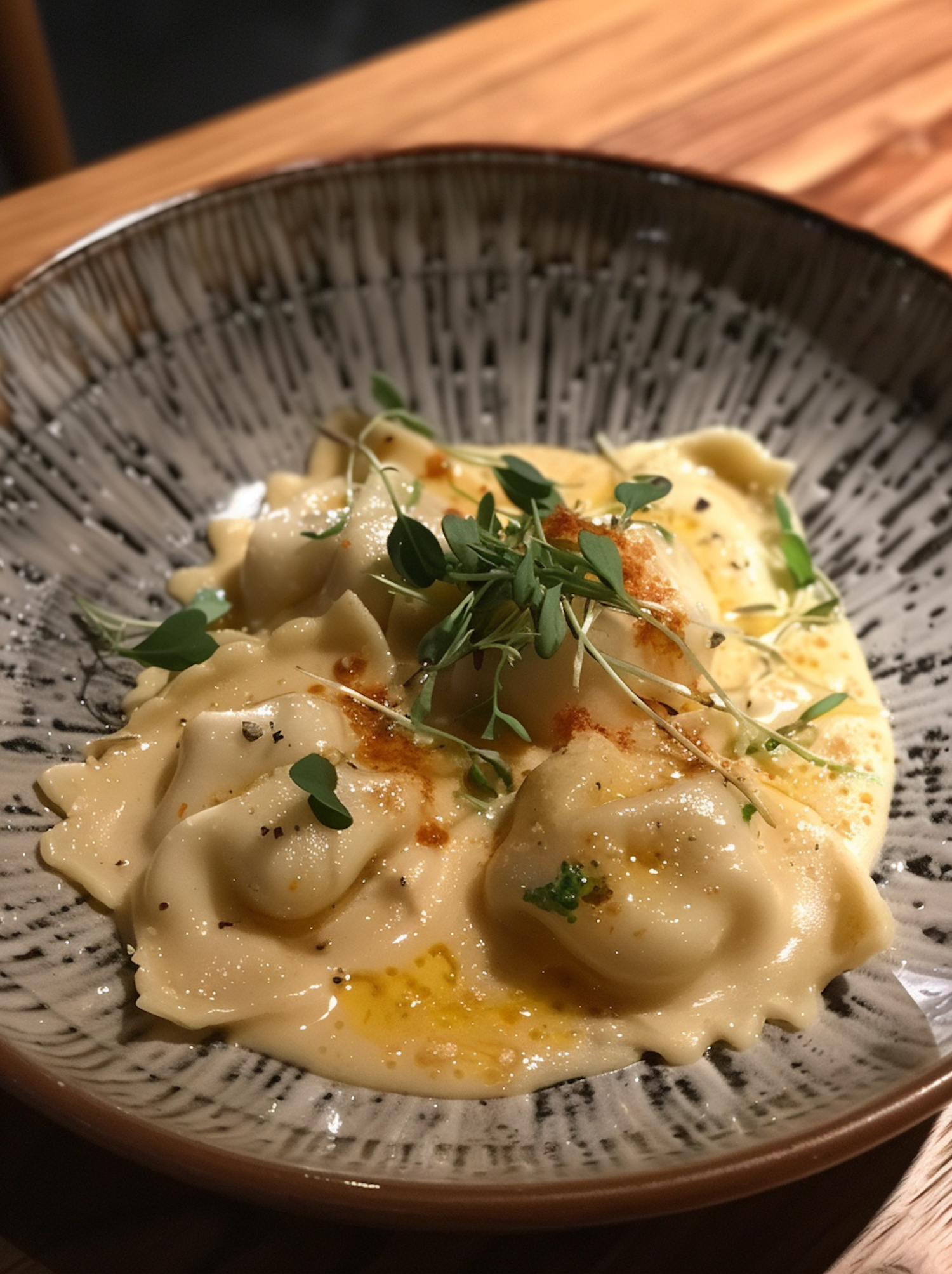 Delicious ravioli in creamy sauce with microgreens and spices, served in a textured ceramic bowl on a wooden table.