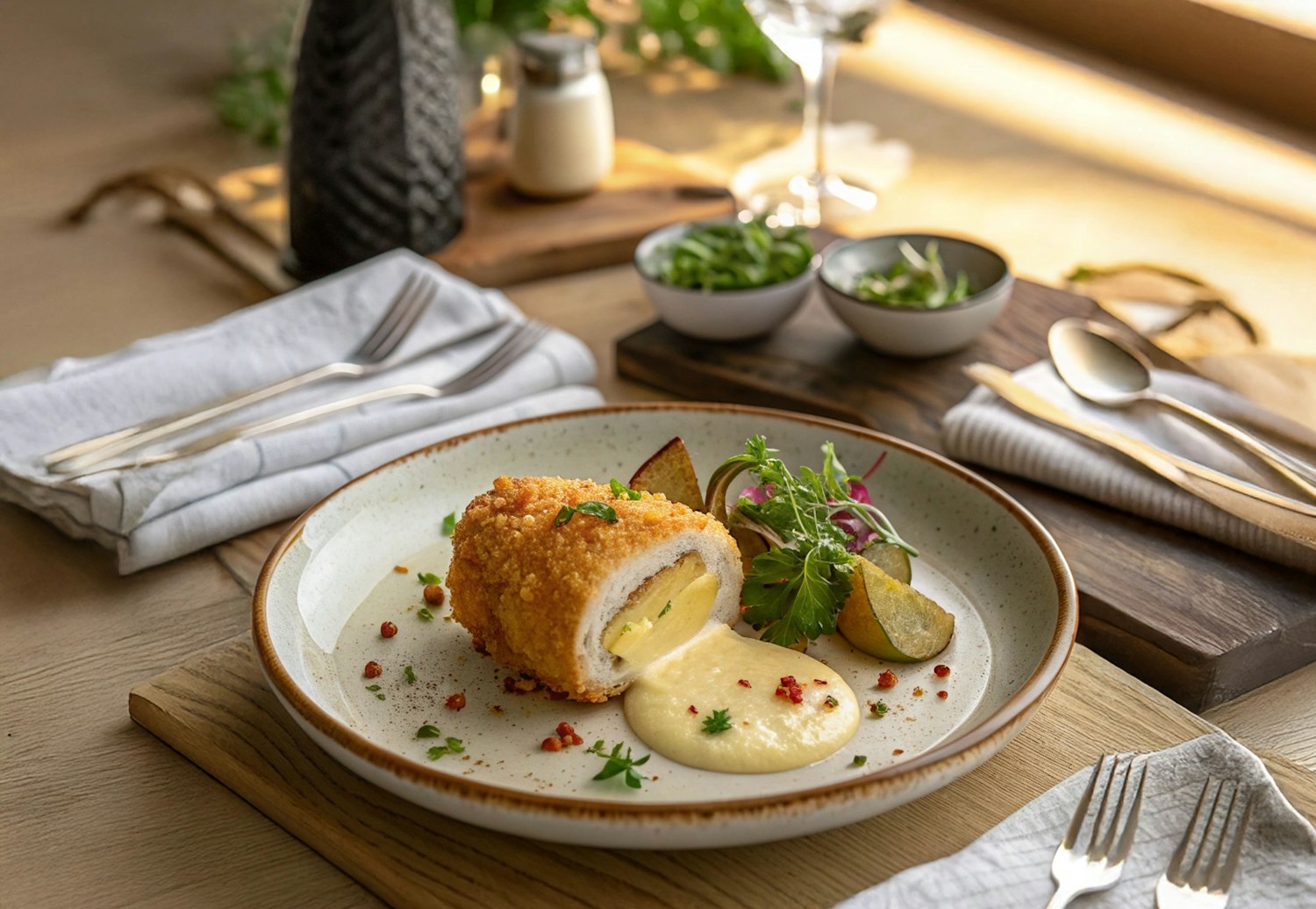 Golden breaded chicken Kiev with creamy sauce, roasted potatoes, and fresh salad on a rustic table setting with natural light.