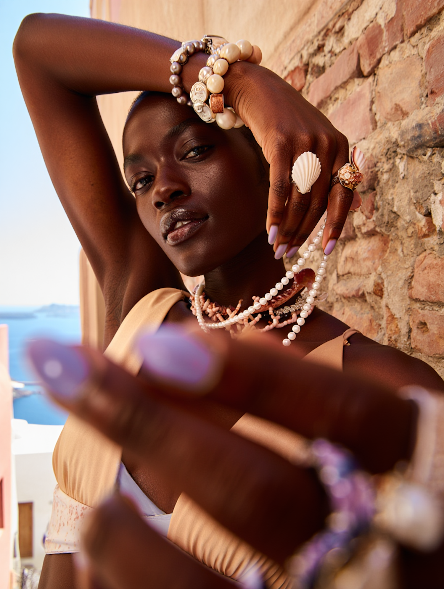 Elegantly styled woman with vibrant jewelry and accessories against a sunny background, highlighting chic and sophisticated fashion.