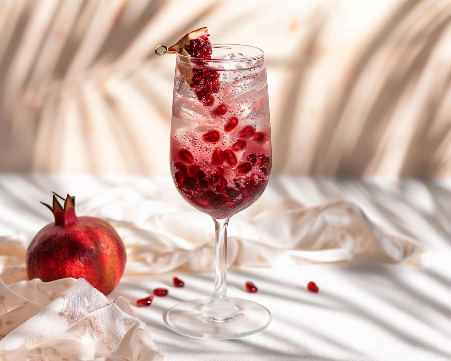Elegant pomegranate sparkling water in a wine glass with ice, garnished with pomegranate slice, set on a white tablecloth with tropical shadows.