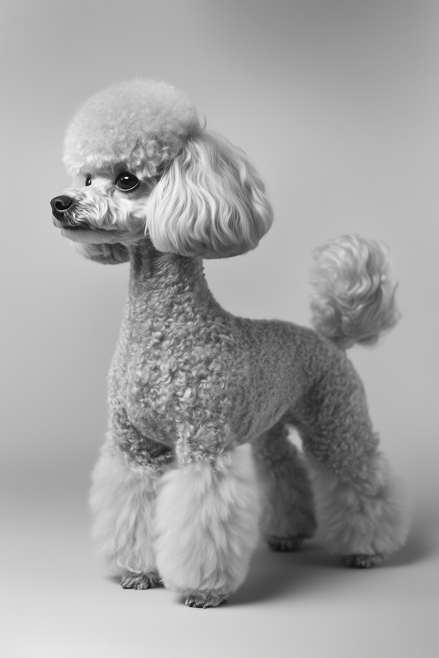 Elegant poodle with fluffy fur and expressive eyes, showcasing meticulous grooming against a neutral background.