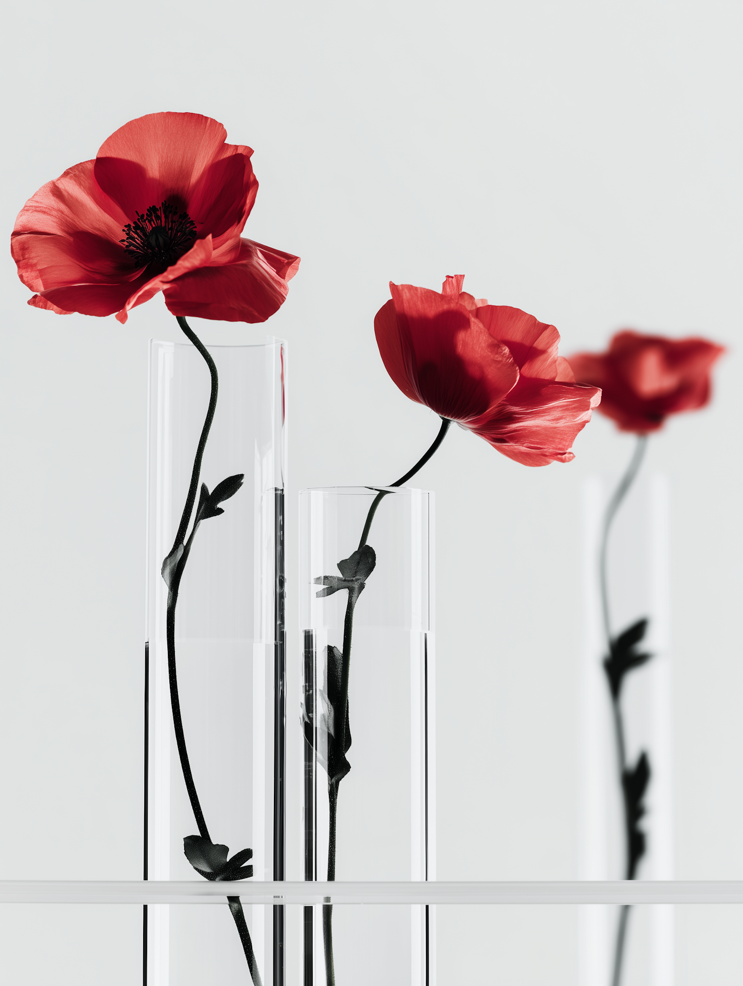 Elegant red poppies in clear glass vases against a minimalist gray background, showcasing their vibrant petals and delicate stems.