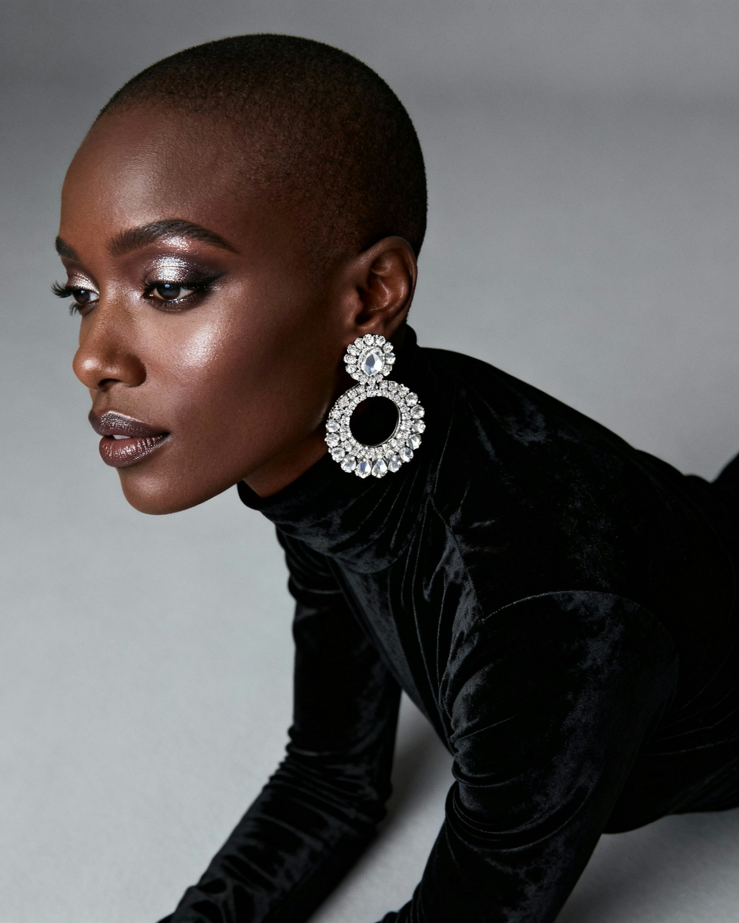 Elegant portrait of a woman in a black velvet top with bold crystal earrings, showcasing a sophisticated and modern style.
