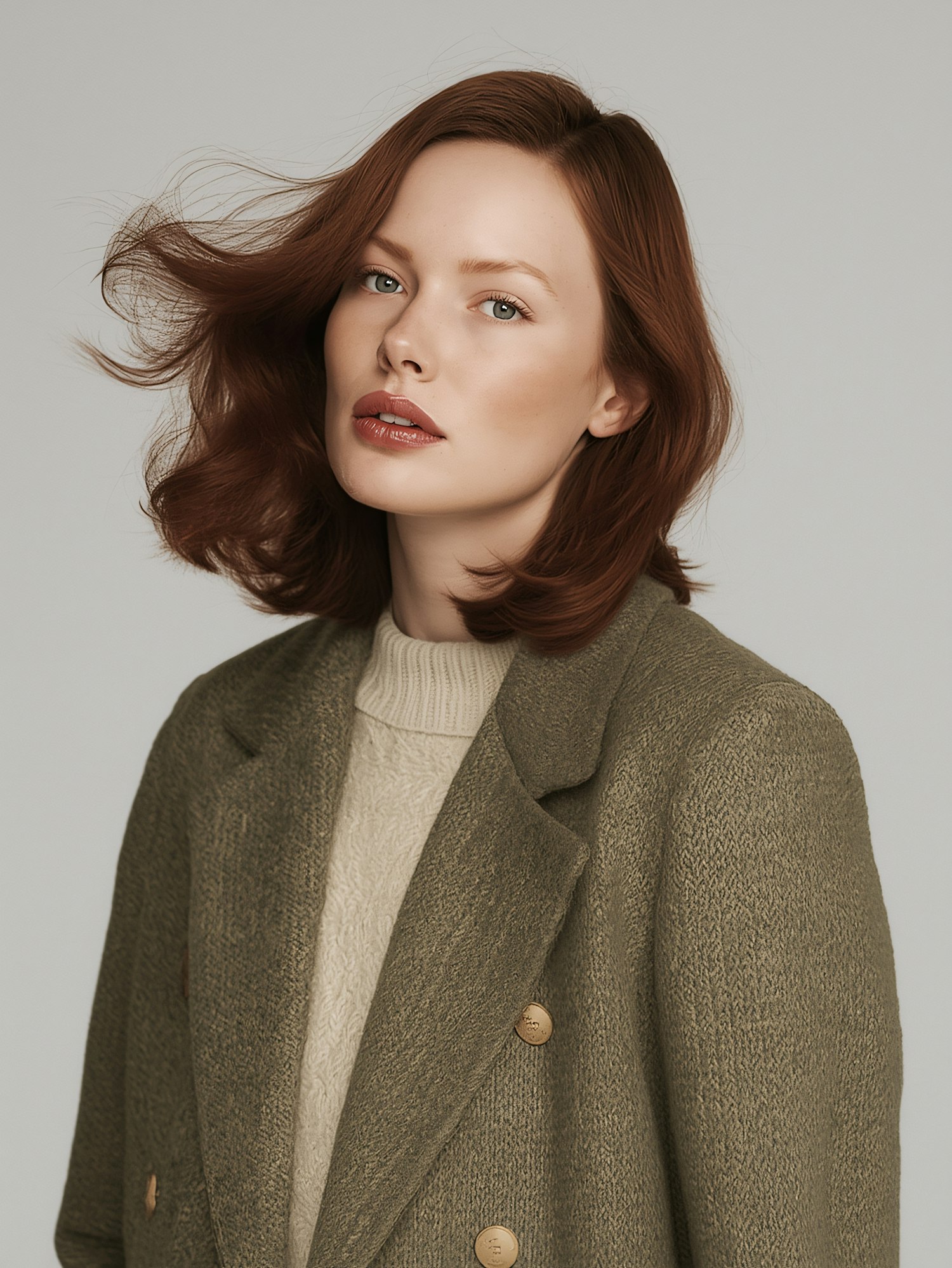 A woman with red hair in a green coat and cream sweater poses against a gray background, showcasing a stylish and elegant look.