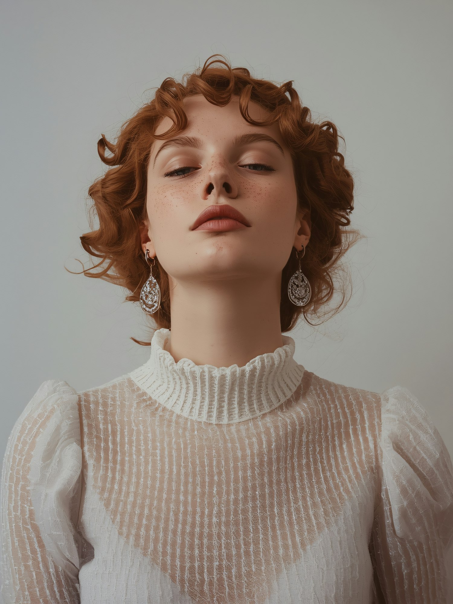 Close-up portrait of a red-haired woman in a white textured blouse and silver earrings, exuding elegance against a neutral background.