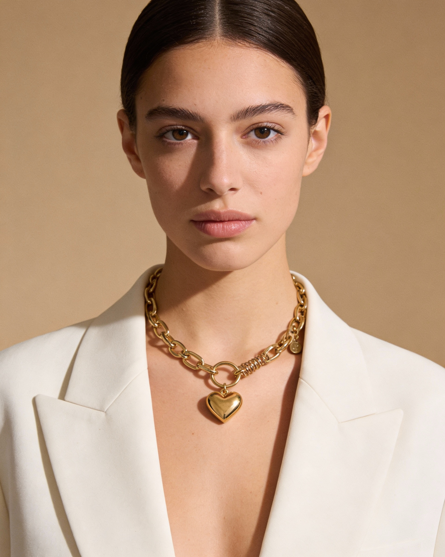 Close-up of a woman wearing a white blazer and a gold heart pendant necklace, set against a neutral beige background.