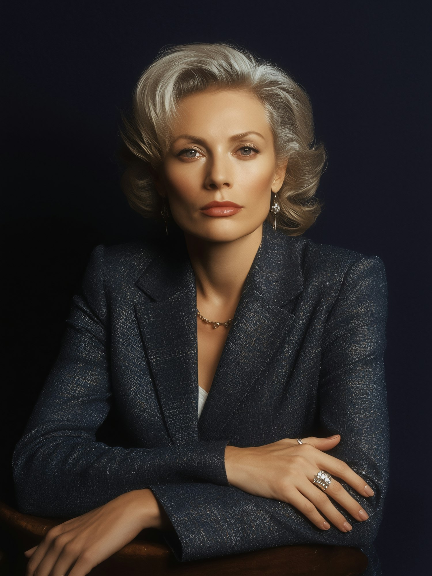 A poised woman with silver hair in a blue blazer, accessorized with jewelry, seated against a dark background.