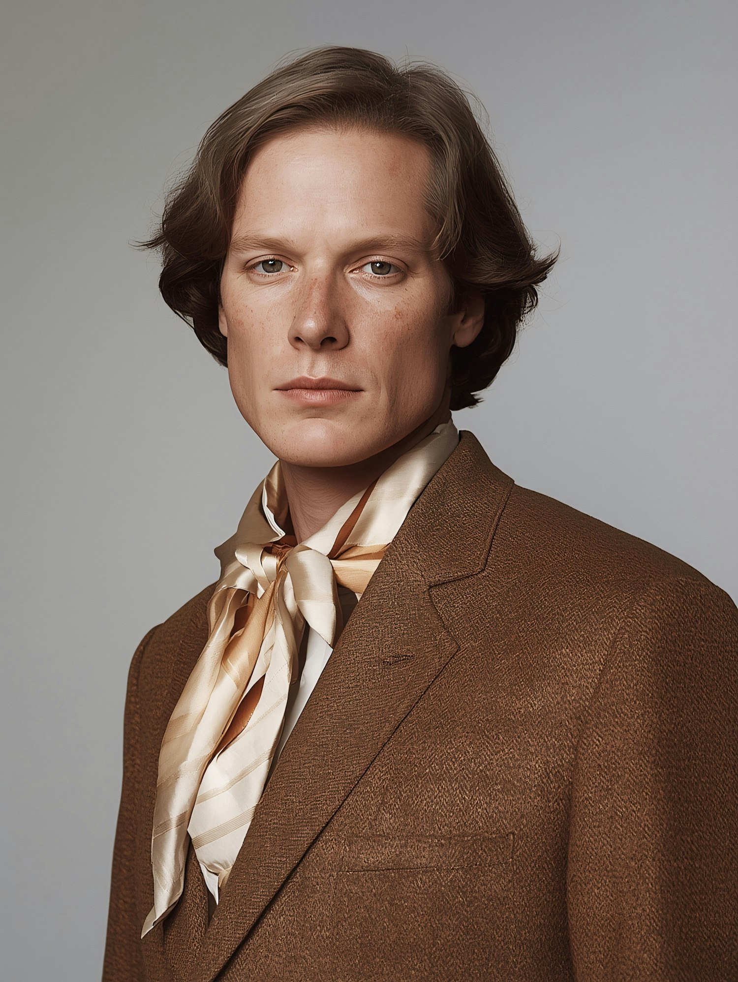 A person in a brown suit and cream scarf poses against a neutral background, showcasing elegant and classic fashion.