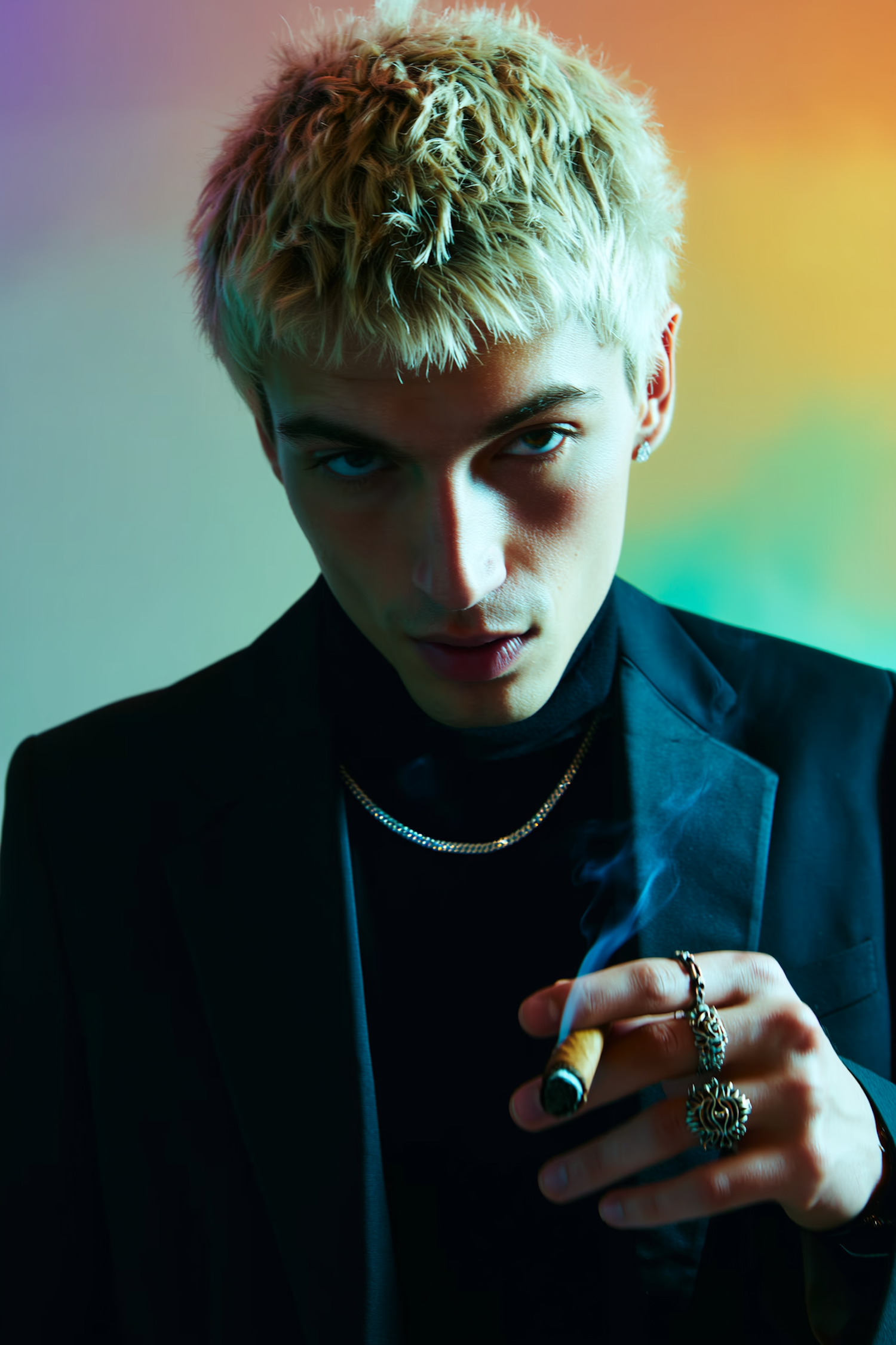 Close-up of a stylish individual with blonde hair, wearing a black outfit and holding a cigar, set against a colorful gradient background.