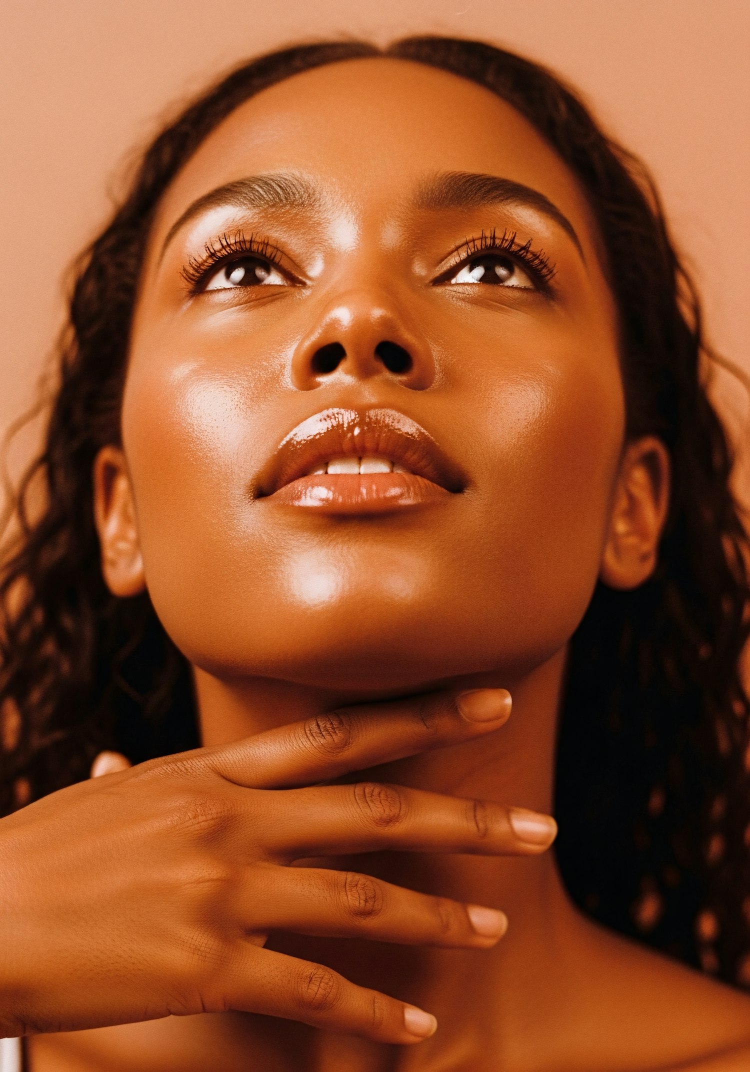 Close-up of a person with glowing skin, glossy lips, and an upward gaze, set against a warm background, exuding elegance and serenity.