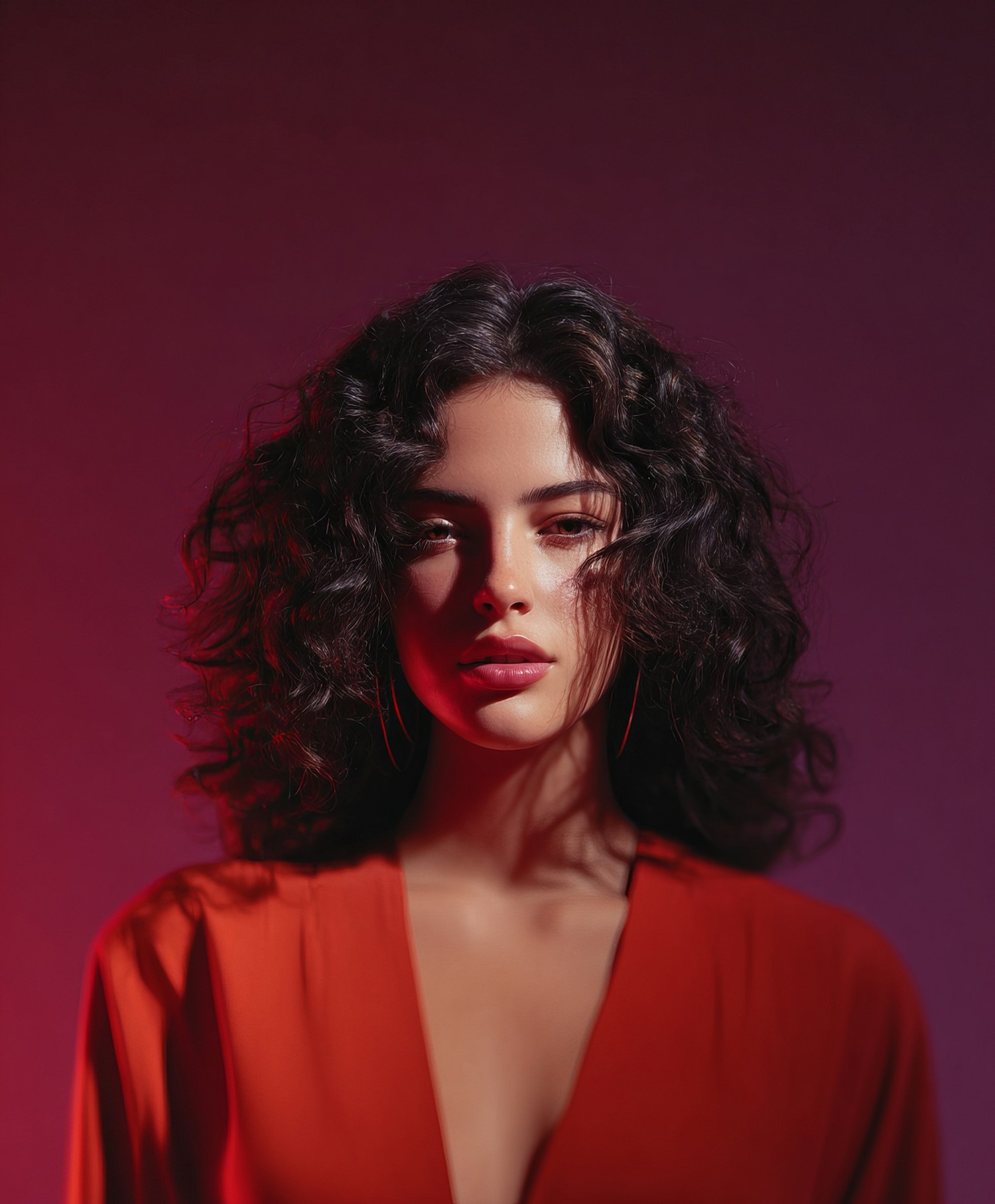 Portrait of a woman with curly black hair, wearing a red outfit, set against a dramatic reddish background.