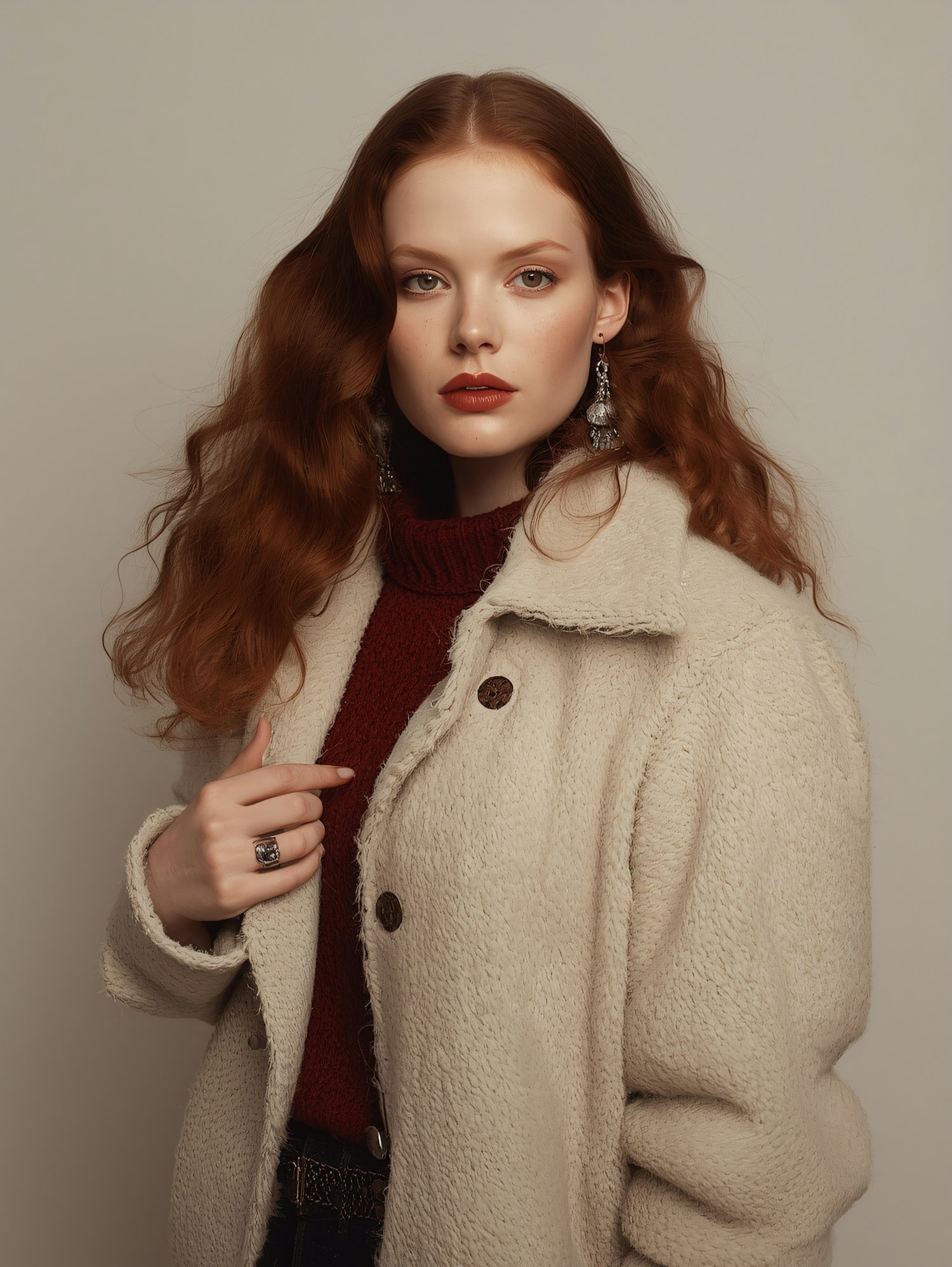 A young woman with auburn hair in a beige coat and red sweater, accessorized with earrings and a ring, posing against a neutral background.