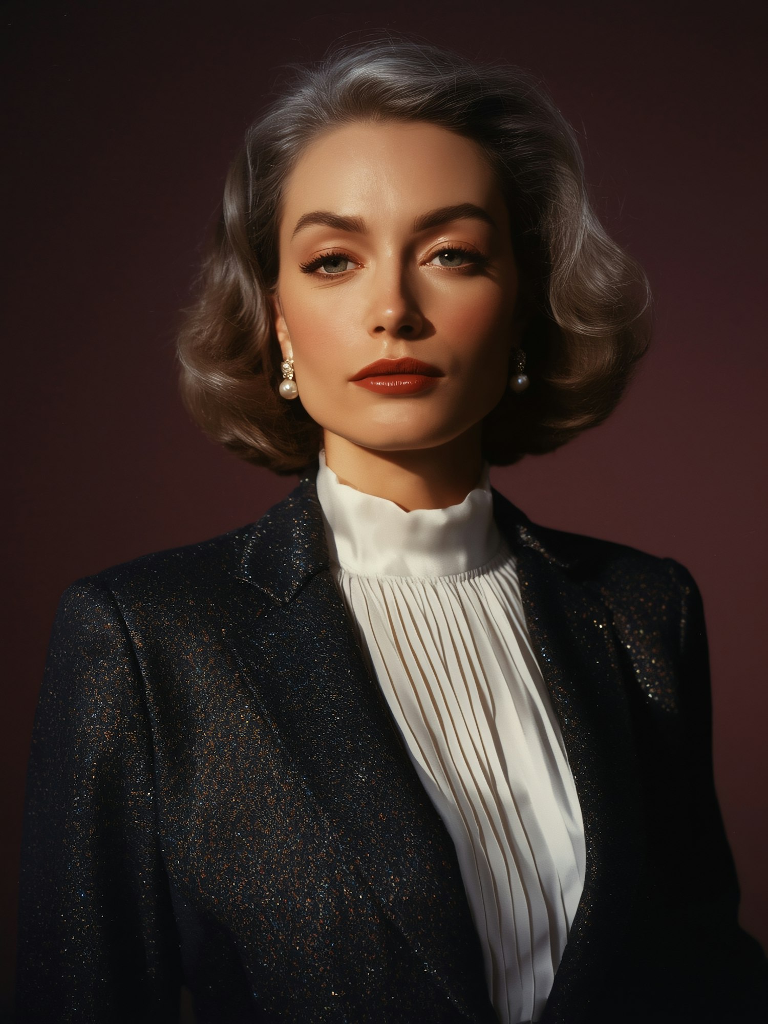 Elegant portrait of a woman with gray hair, wearing a shimmering blazer and pearl earrings, set against a dark background.